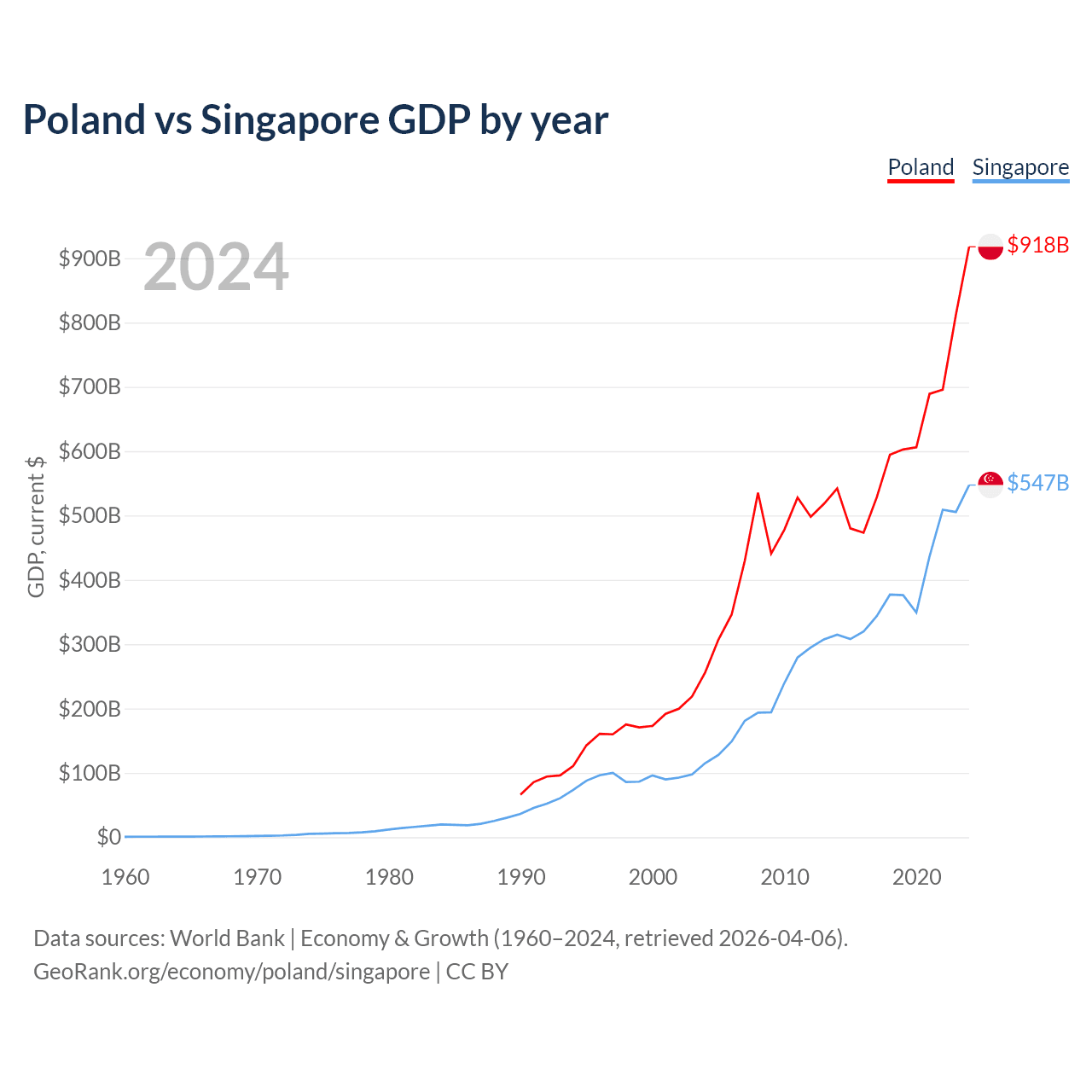 Poland has a GDP of $918B compared to $547B for Singapore, ranking 21/197 and 28/197 by economy size, respectively.