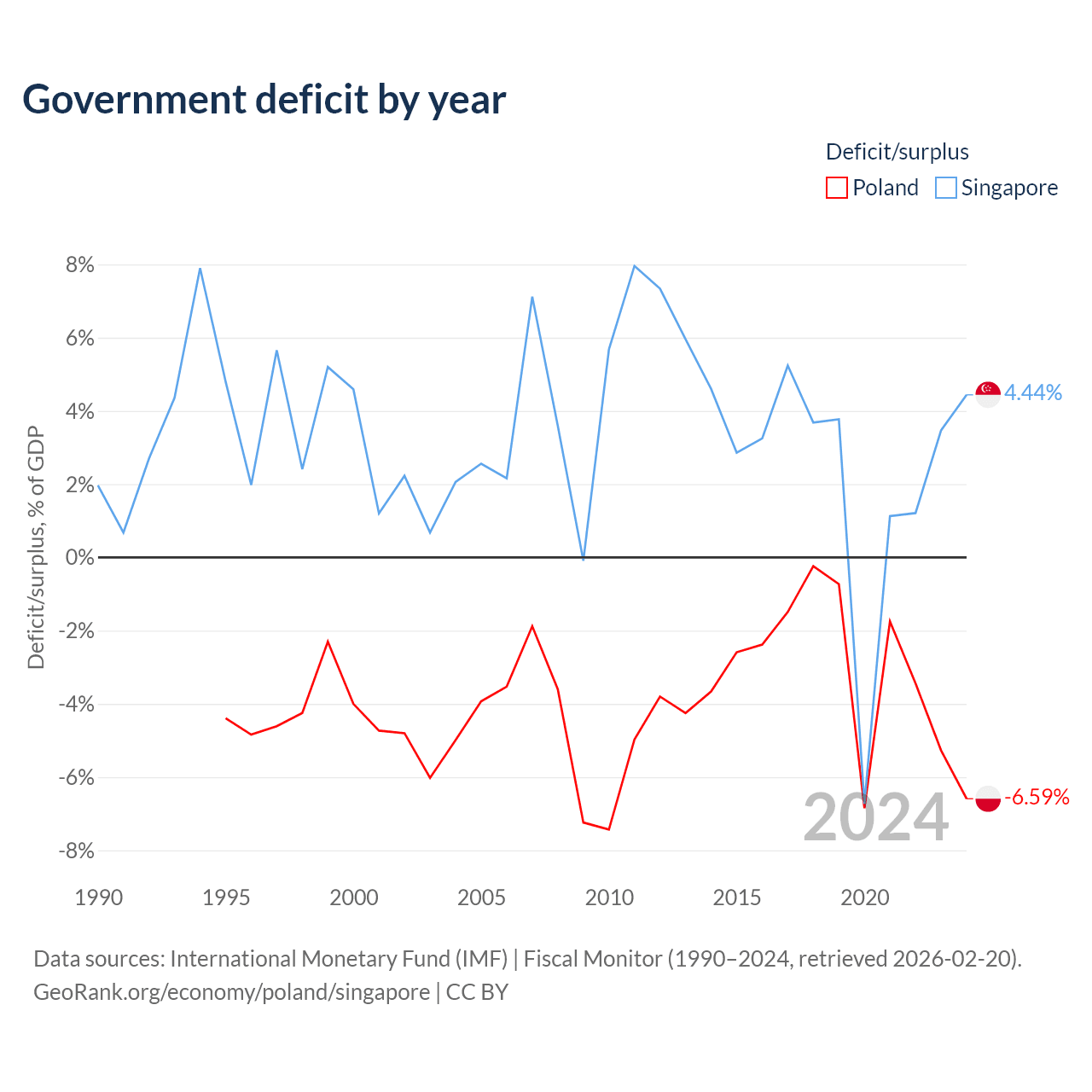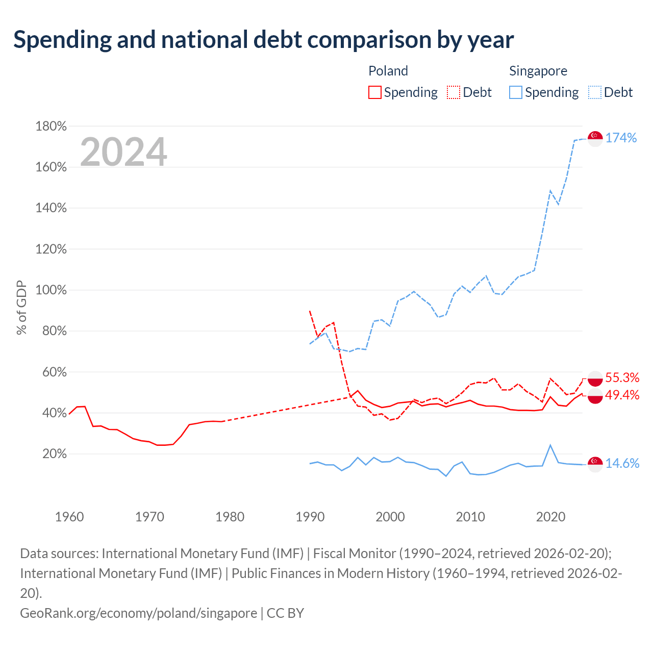 Poland has $507B in government debt (55.3% of GDP), compared to $950B (173.5% of GDP) in Singapore.