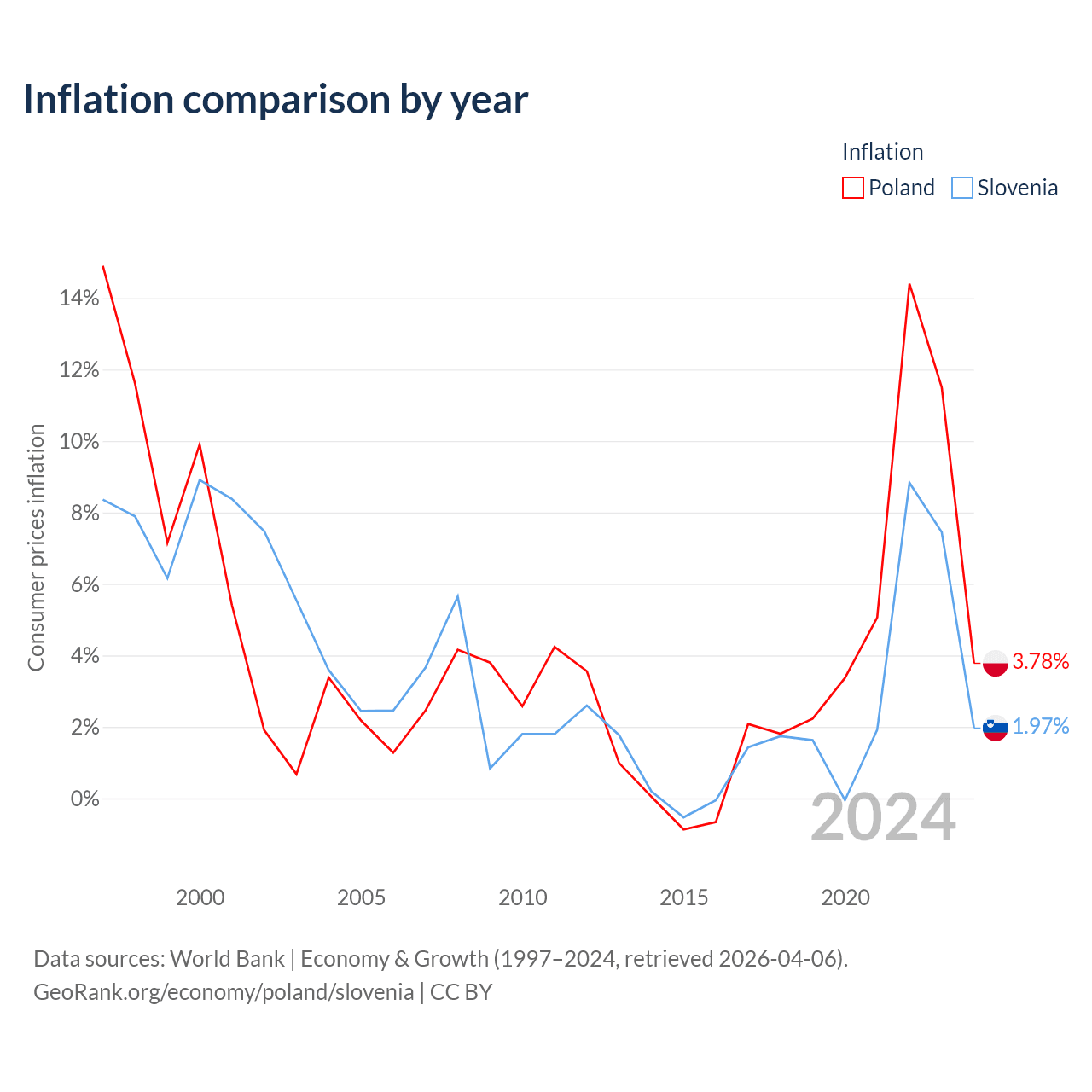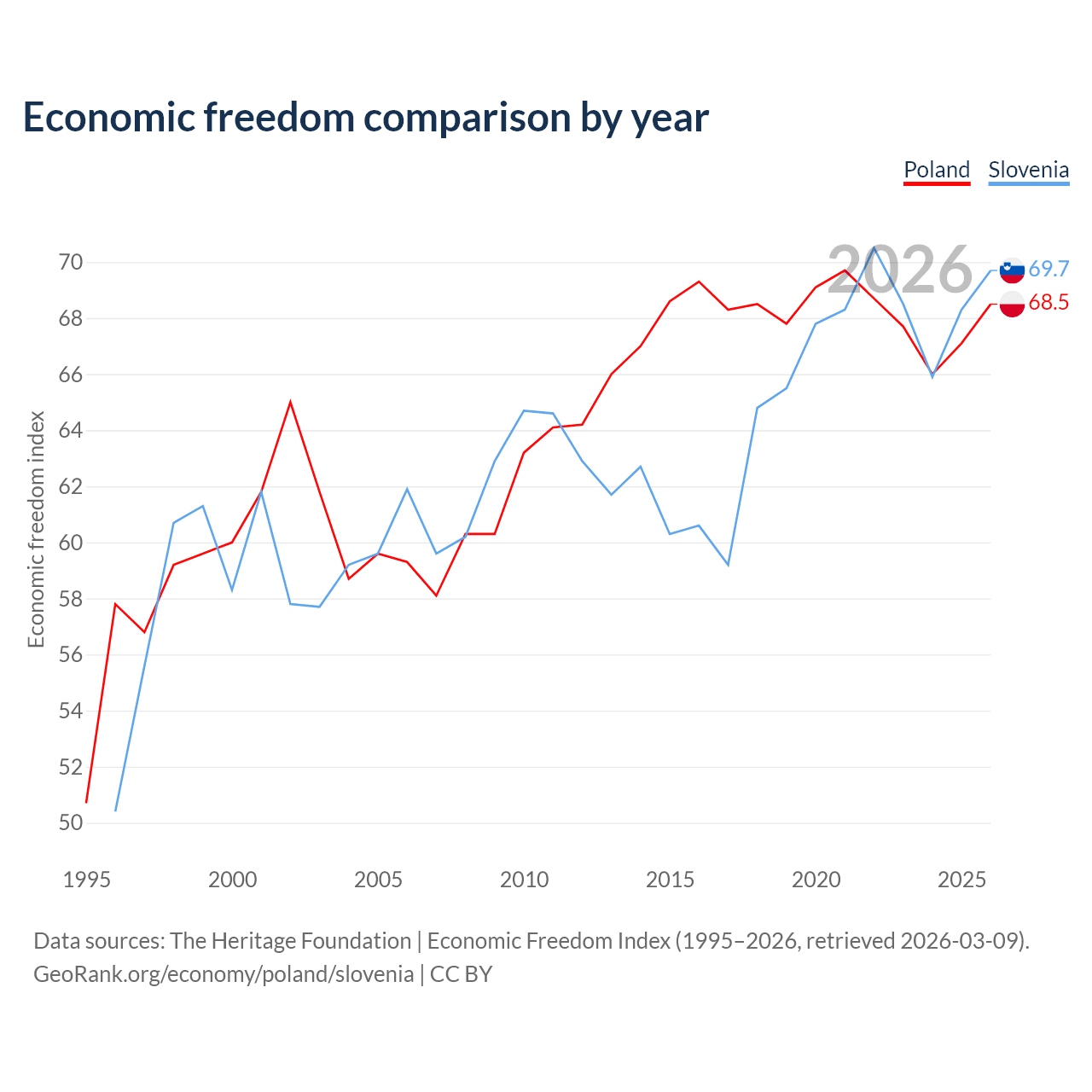 The Economic Freedom Index for Poland is 68.5, ranking 46/197, compared to 69.7 for Slovenia, ranking 40/197. The chart above displays a comparison of annual changes in economic freedom indexes.