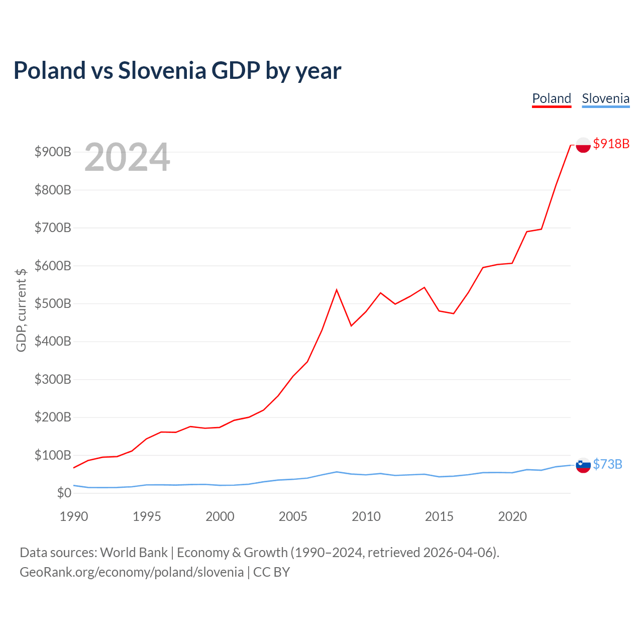 Poland has a GDP of $918B compared to $73B for Slovenia, ranking 21/197 and 86/197 by economy size, respectively.
