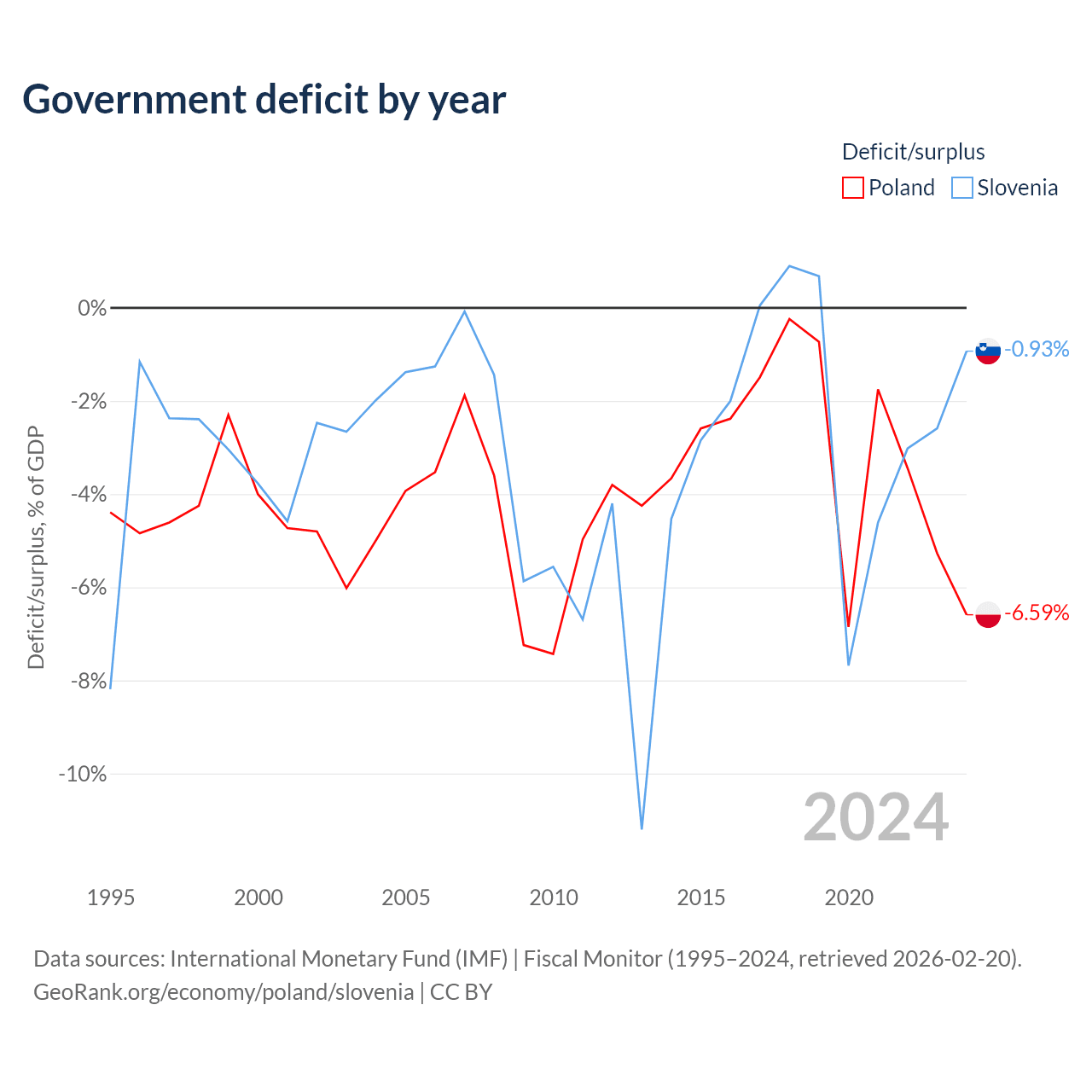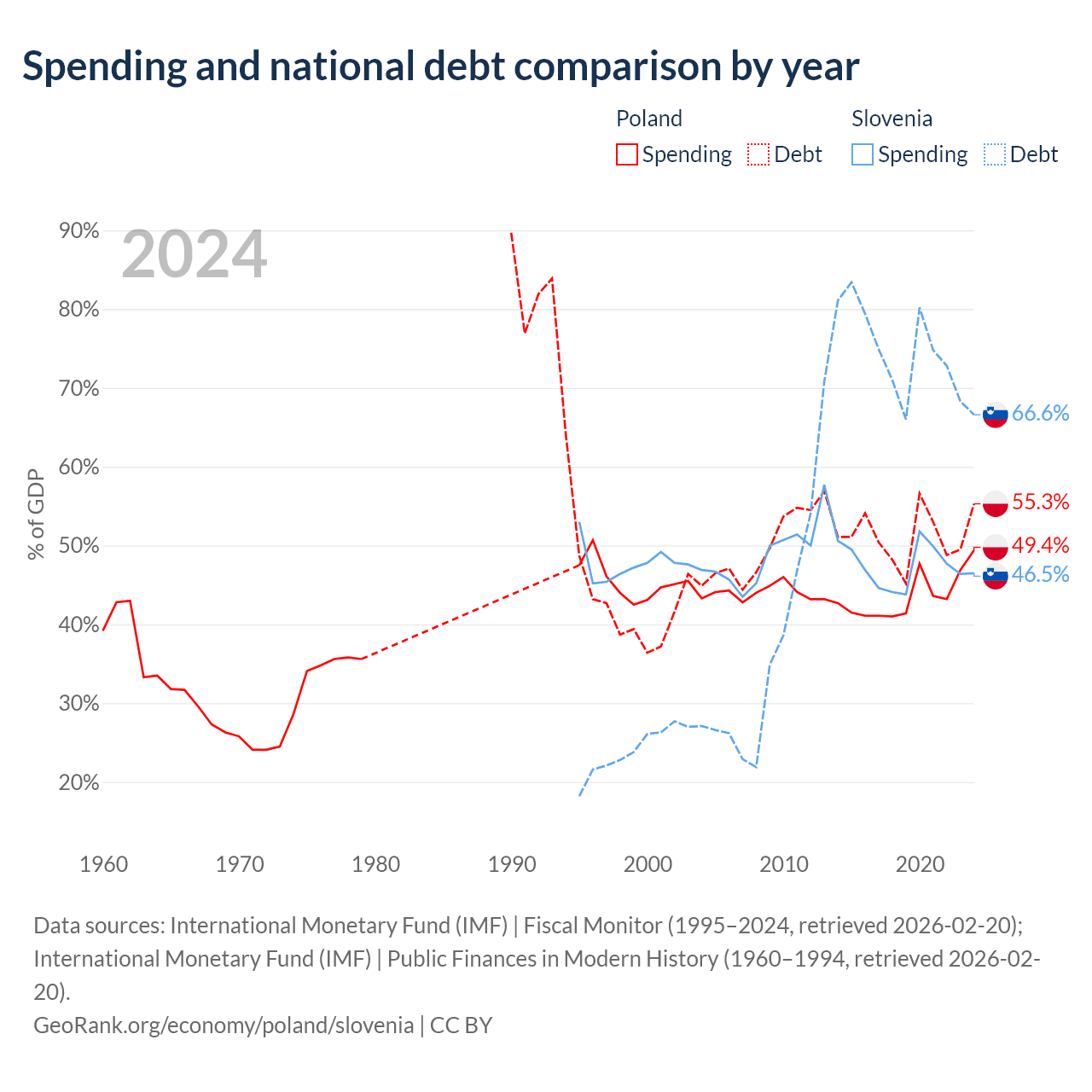 Poland has $507B in government debt (55.3% of GDP), compared to $48.6B (66.6% of GDP) in Slovenia.