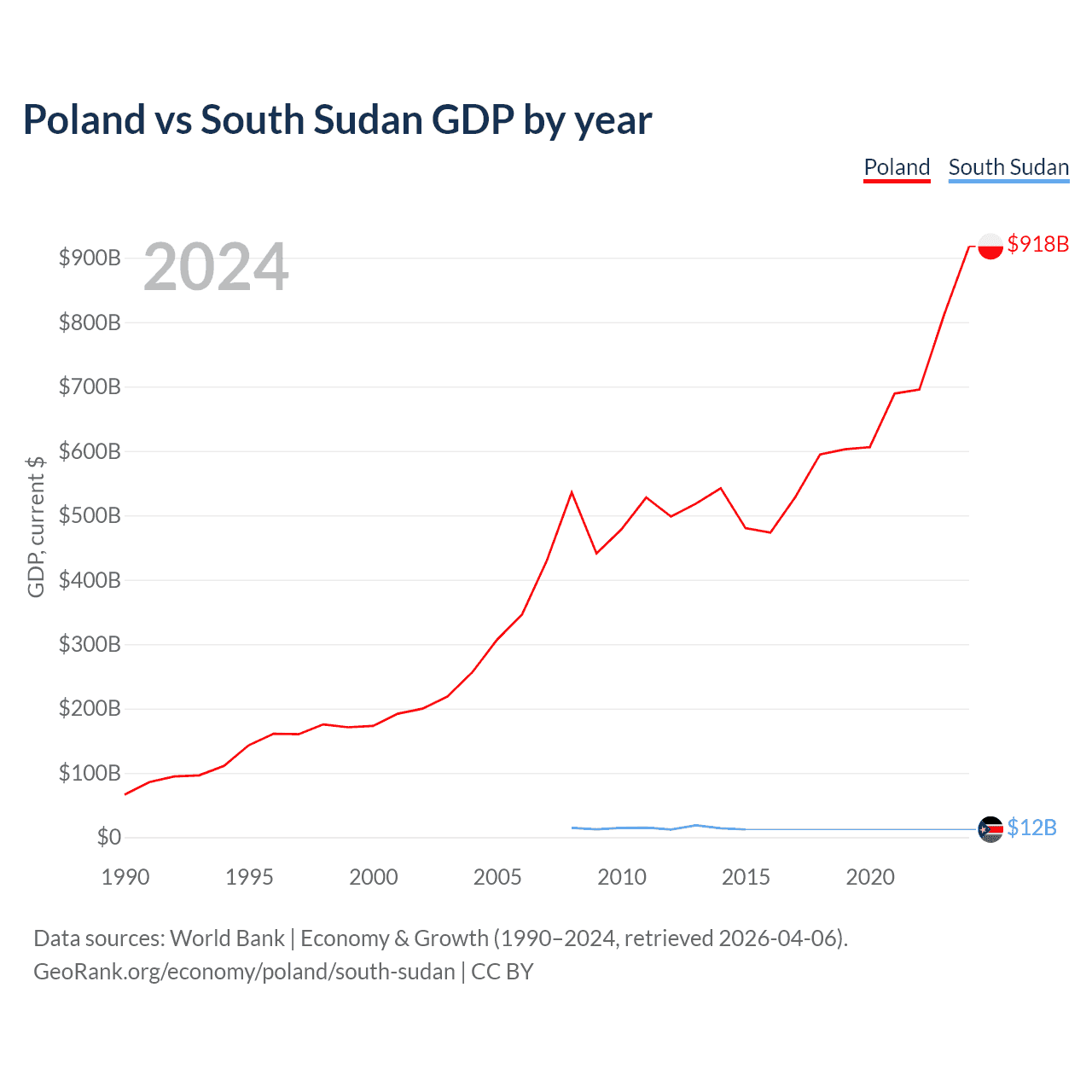 Poland has a GDP of $918B compared to $12B for South Sudan, ranking 21/197 and 149/197 by economy size, respectively.