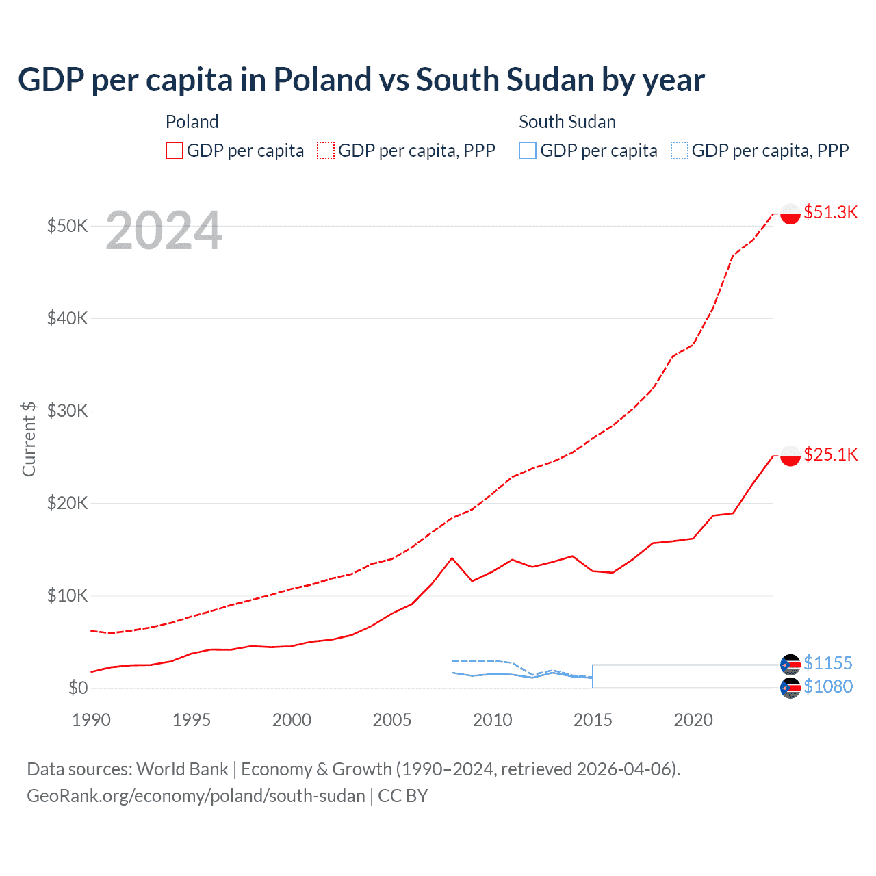 Poland's GDP per capita is $25,104, ranking 48/197, compared to $1,080 in South Sudan, ranking 175/197. Adjusted for purchasing power (GDP per capita PPP), Poland ranks 43rd at $51,263, while South Sudan ranks 197th at $1,155.