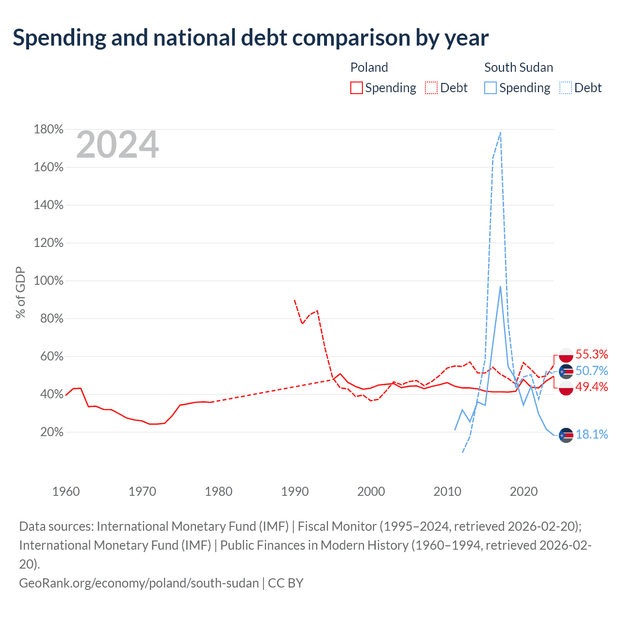 Poland has $507B in government debt (55.3% of GDP), compared to $7.04B (50.7% of GDP) in South Sudan.