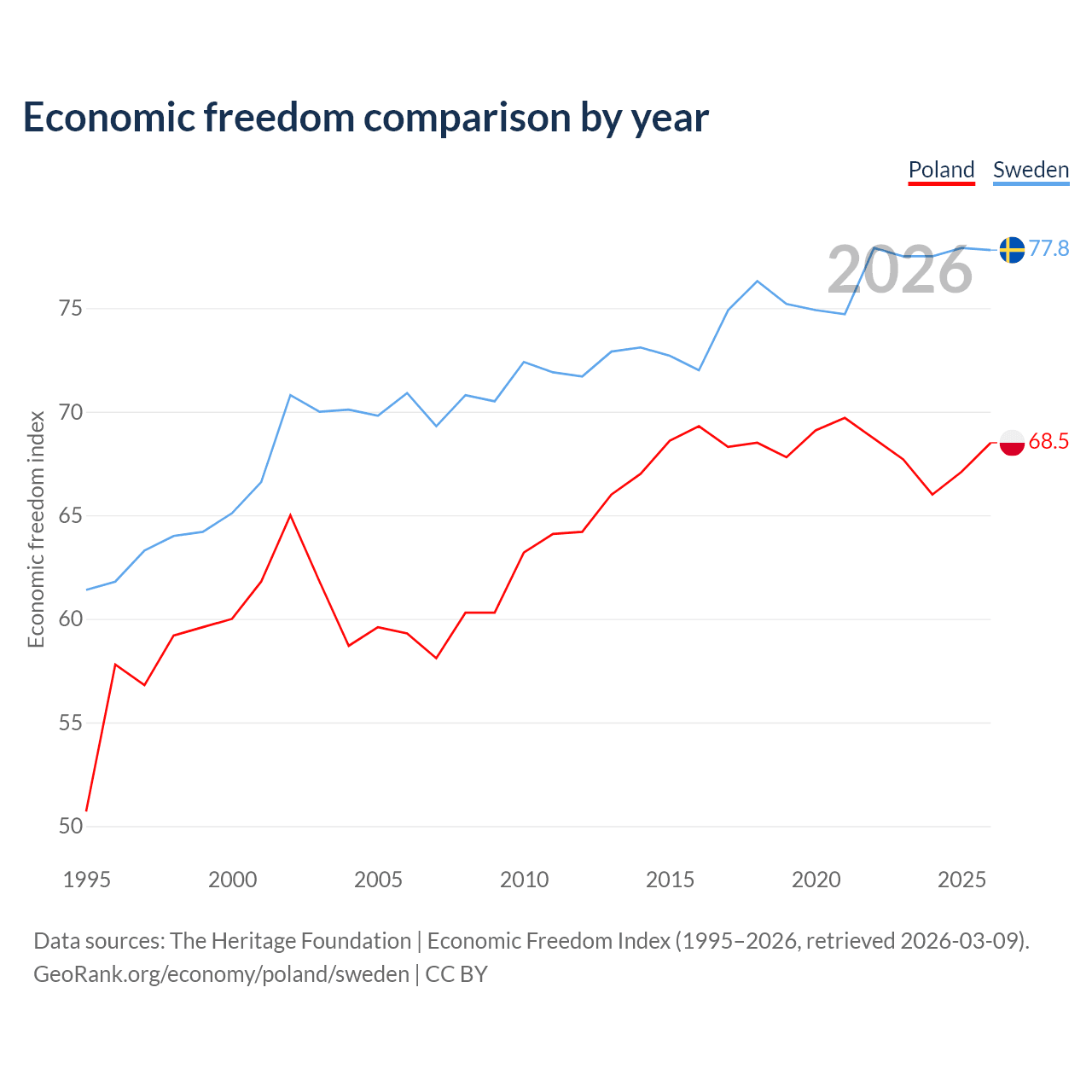 The Economic Freedom Index for Poland is 68.5, ranking 46/197, compared to 77.8 for Sweden, ranking 14/197. The chart above displays a comparison of annual changes in economic freedom indexes.