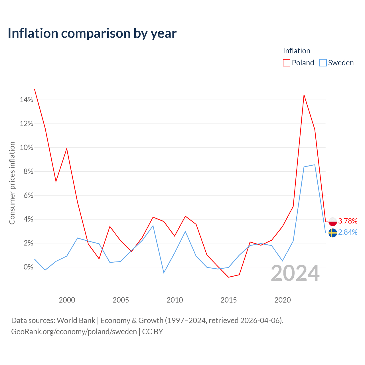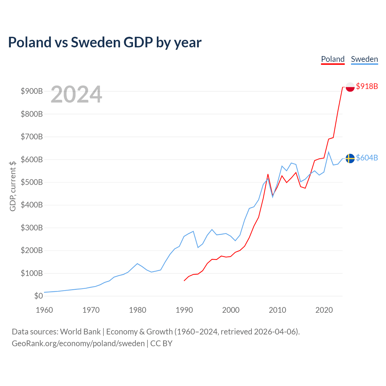 Poland has a GDP of $918B compared to $604B for Sweden, ranking 21/197 and 26/197 by economy size, respectively.