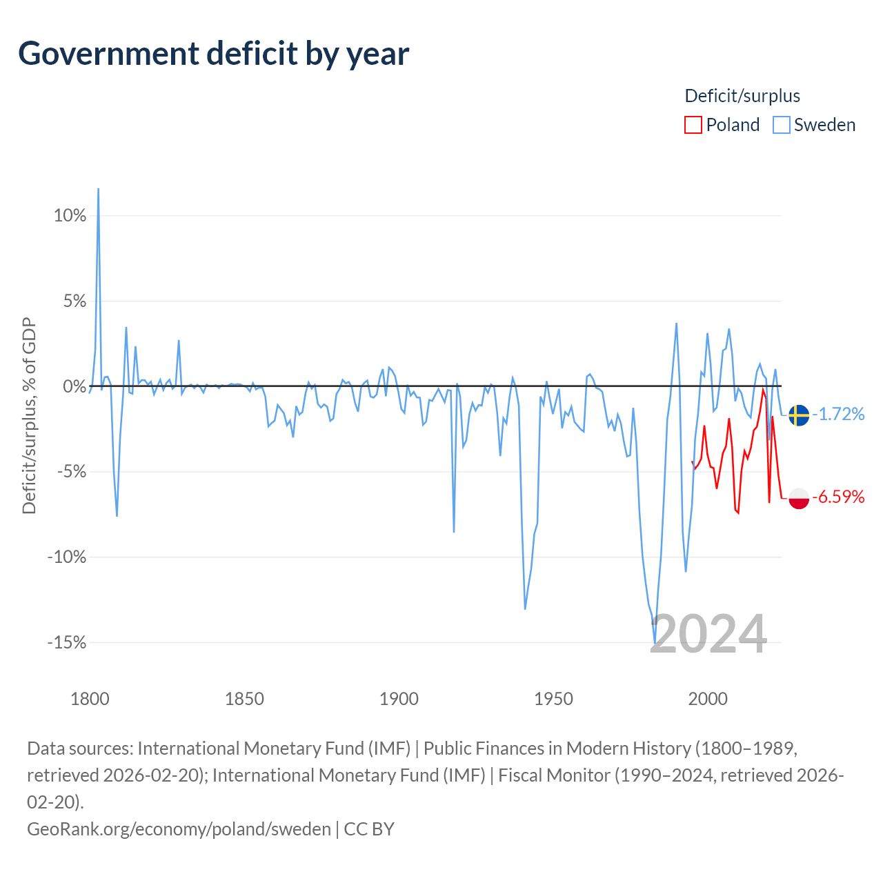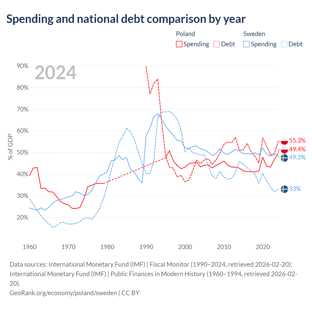 Poland has $507B in government debt (55.3% of GDP), compared to $199B (33% of GDP) in Sweden.