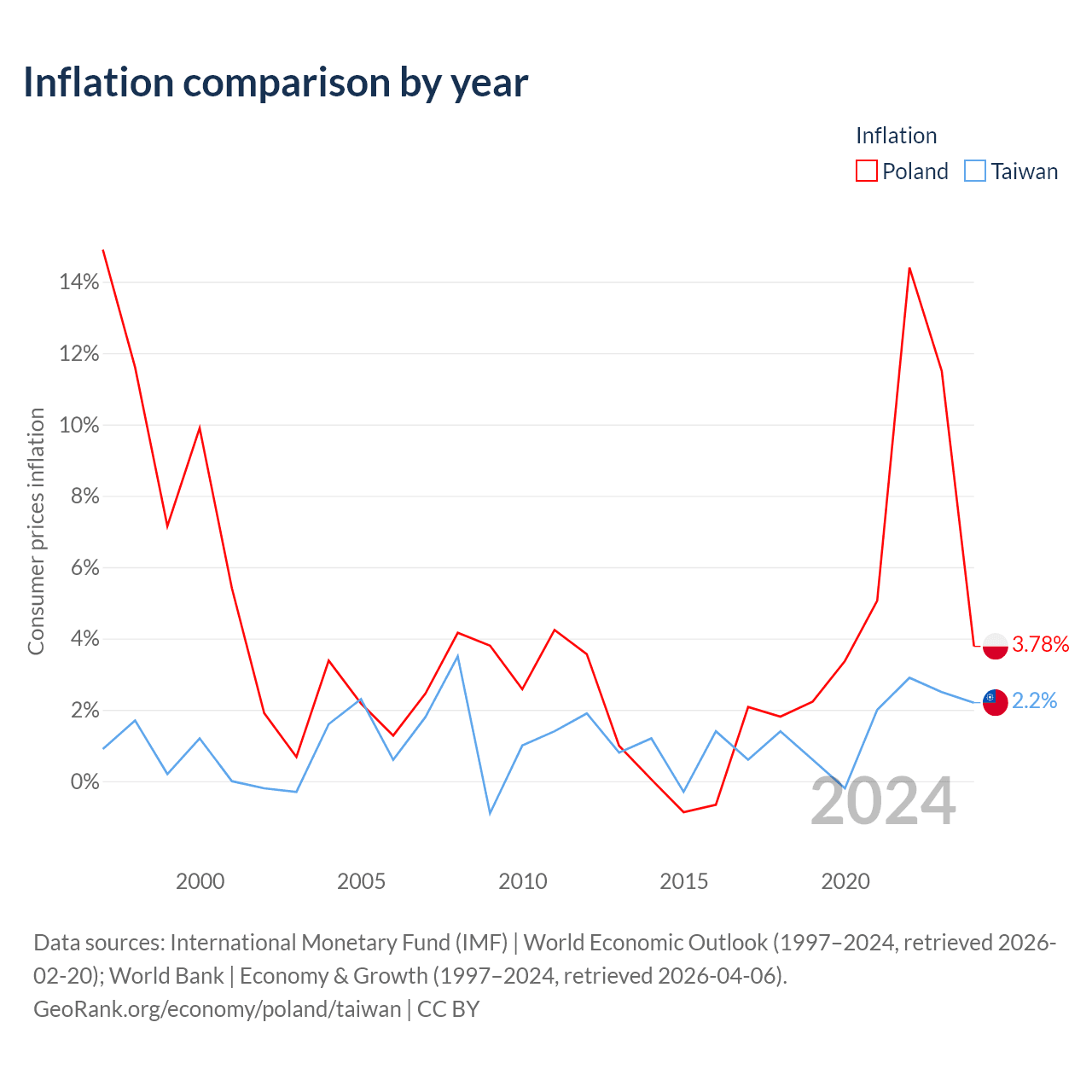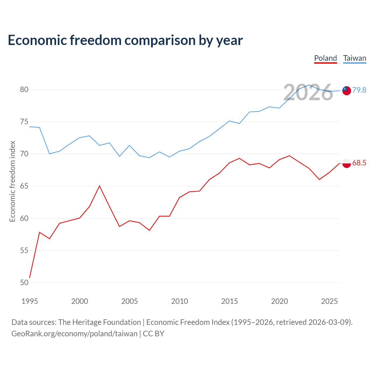 The Economic Freedom Index for Poland is 68.5, ranking 46/197, compared to 79.8 for Taiwan, ranking 6/197. The chart above displays a comparison of annual changes in economic freedom indexes.