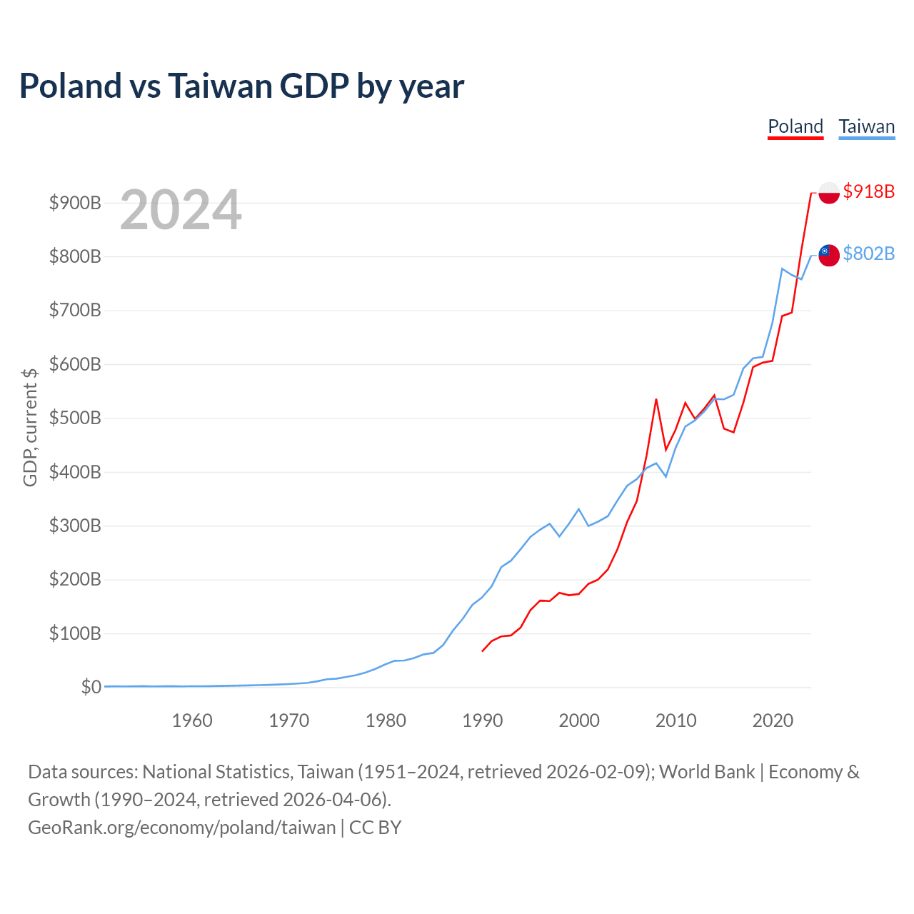 Poland has a GDP of $918B compared to $802B for Taiwan, ranking 21/197 and 22/197 by economy size, respectively.