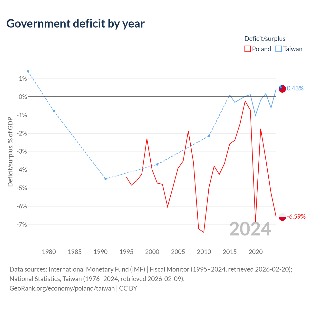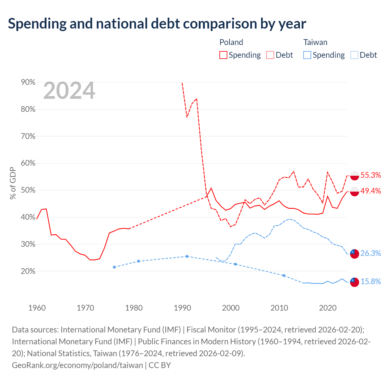Poland has $507B in government debt (55.3% of GDP), compared to $211B (26.3% of GDP) in Taiwan.