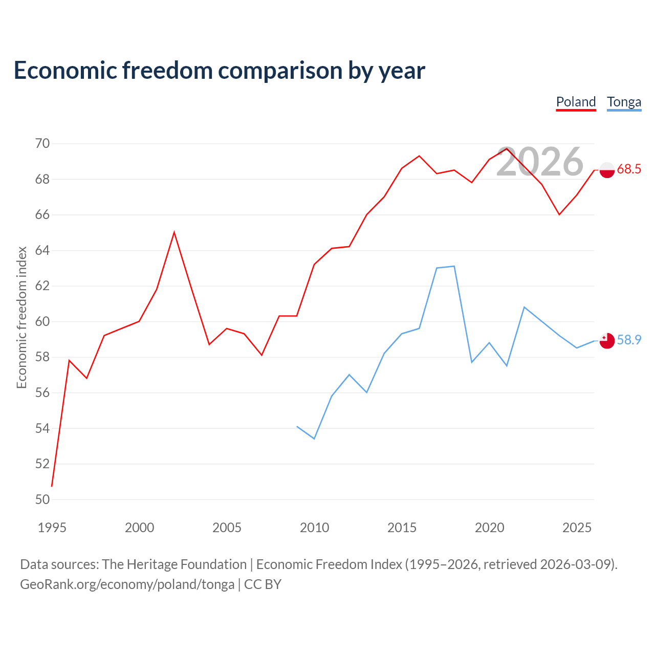 The Economic Freedom Index for Poland is 68.5, ranking 46/197, compared to 58.9 for Tonga, ranking 107/197. The chart above displays a comparison of annual changes in economic freedom indexes.