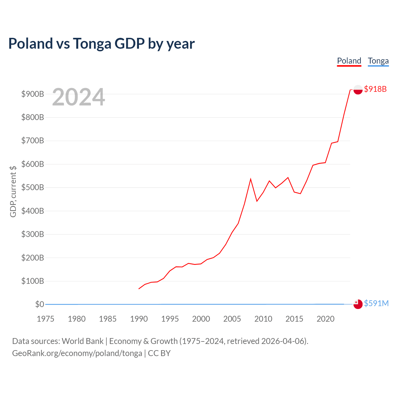 Poland has a GDP of $918B compared to $591M for Tonga, ranking 21/197 and 191/197 by economy size, respectively.