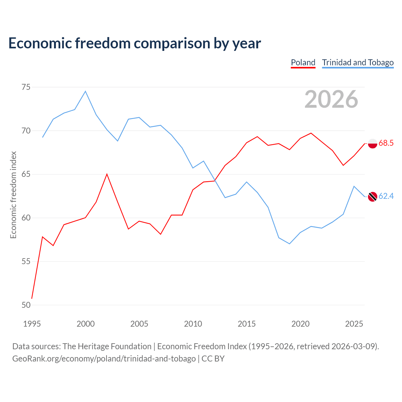 The Economic Freedom Index for Poland is 68.5, ranking 46/197, compared to 62.4 for Trinidad and Tobago, ranking 87/197. The chart above displays a comparison of annual changes in economic freedom indexes.
