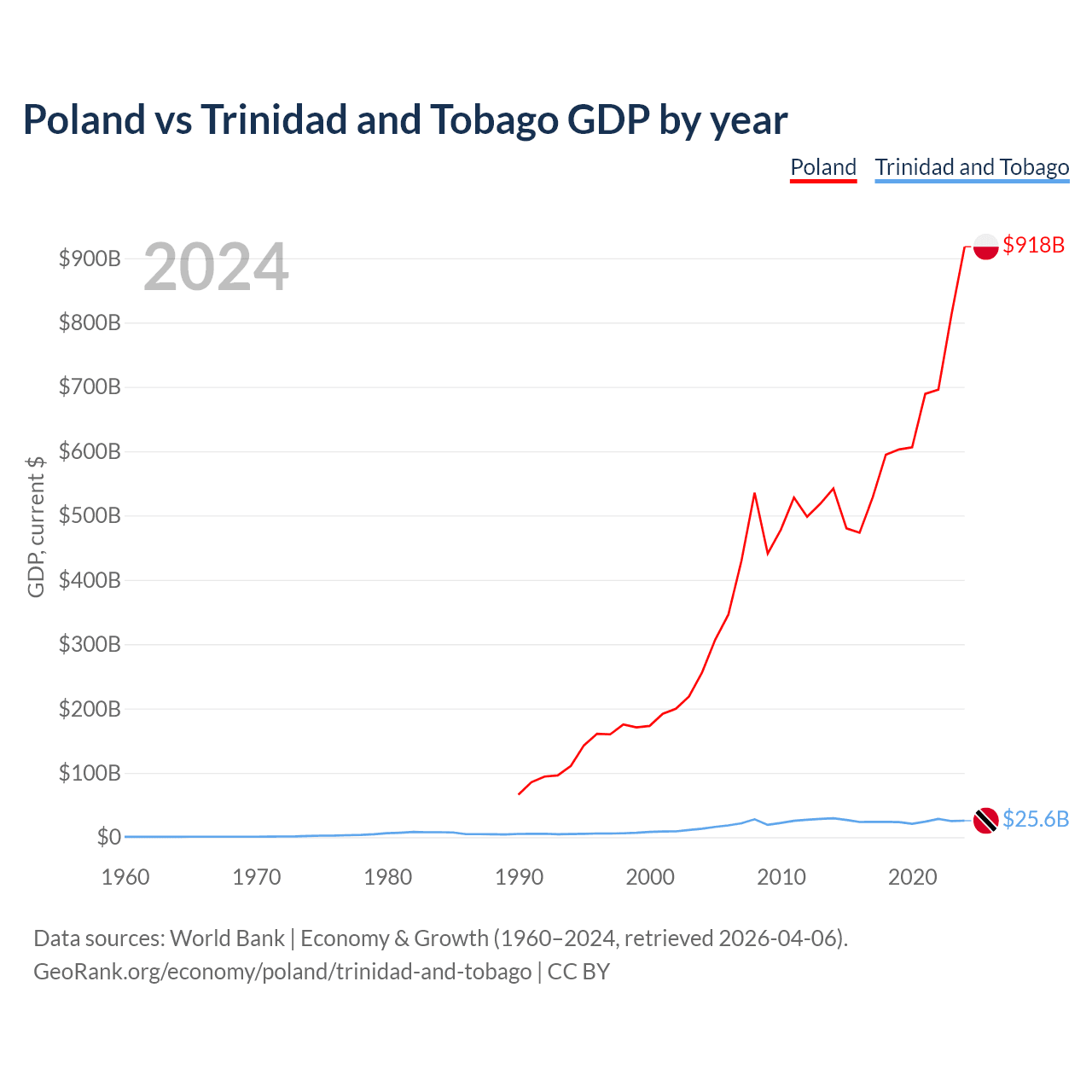 Poland has a GDP of $918B compared to $25.6B for Trinidad and Tobago, ranking 21/197 and 115/197 by economy size, respectively.