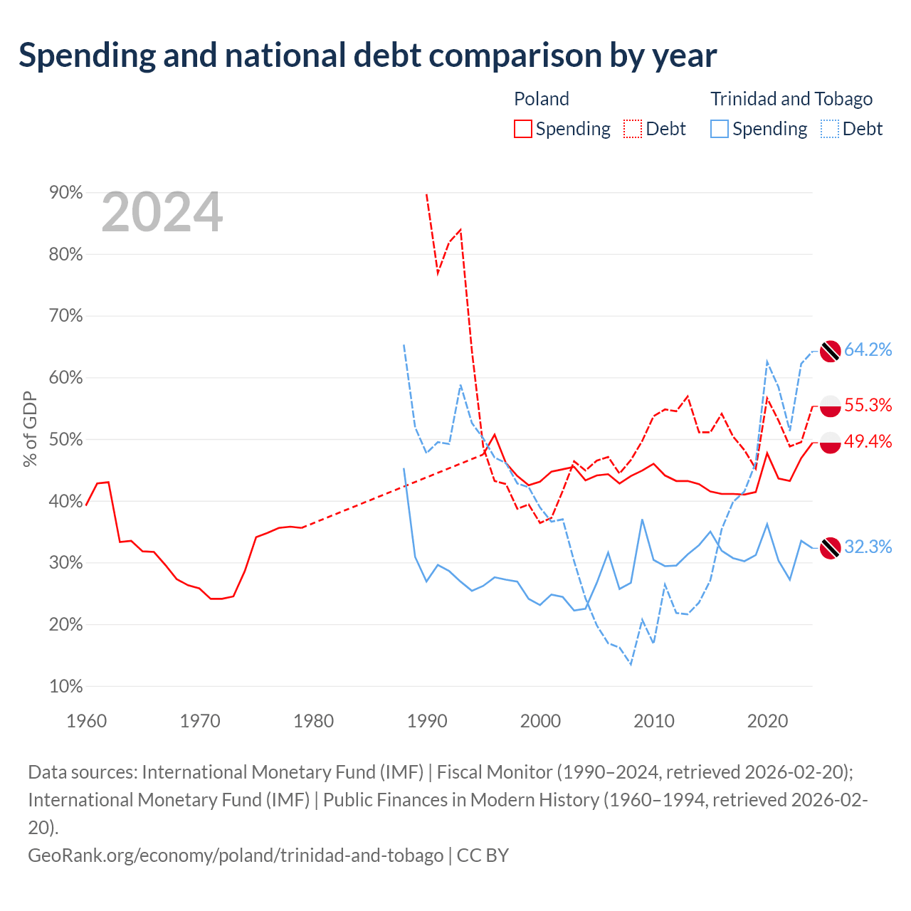 Poland has $507B in government debt (55.3% of GDP), compared to $16.5B (64.2% of GDP) in Trinidad and Tobago.