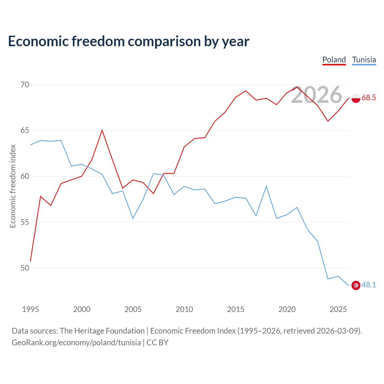 The Economic Freedom Index for Poland is 68.5, ranking 46/197, compared to 48.1 for Tunisia, ranking 172/197. The chart above displays a comparison of annual changes in economic freedom indexes.