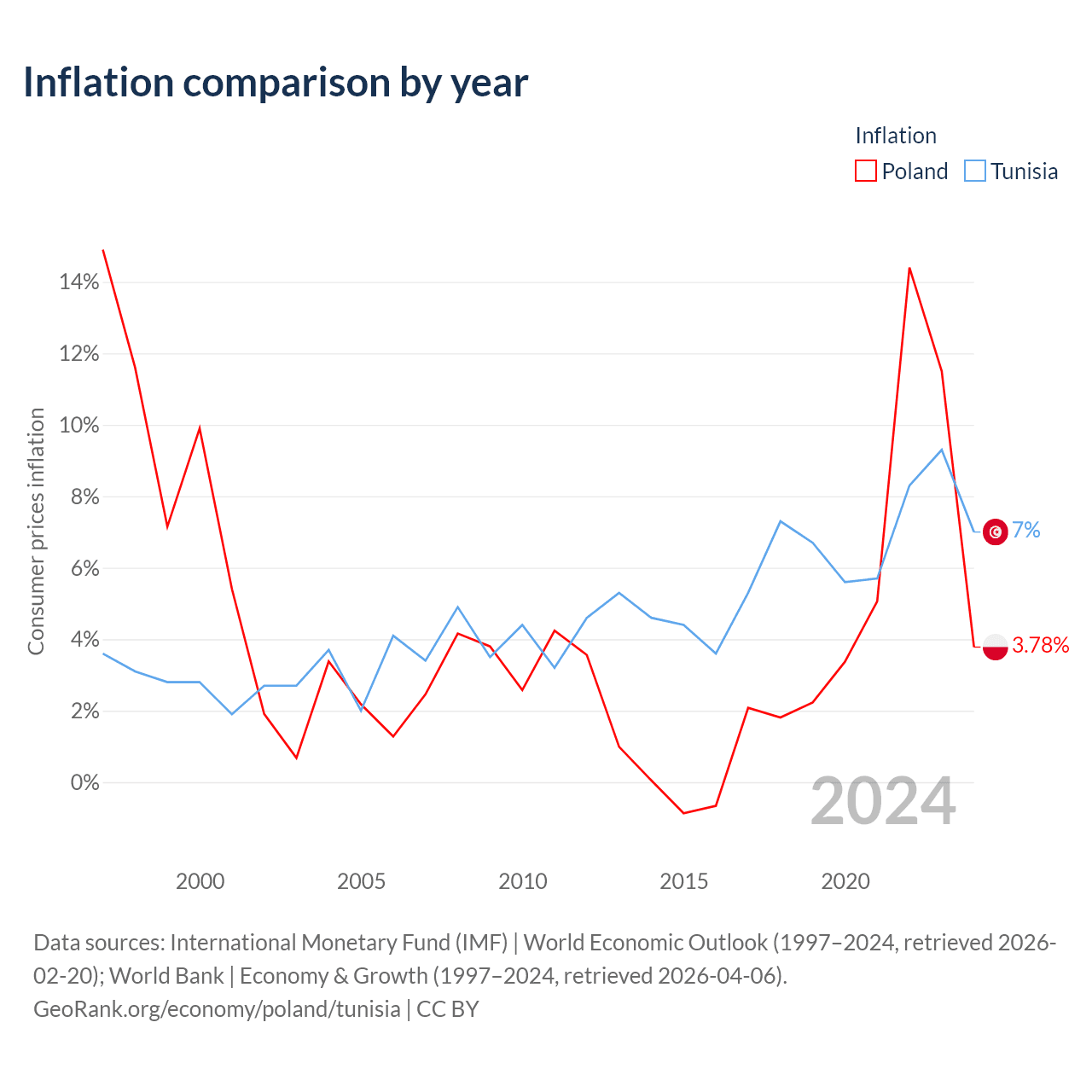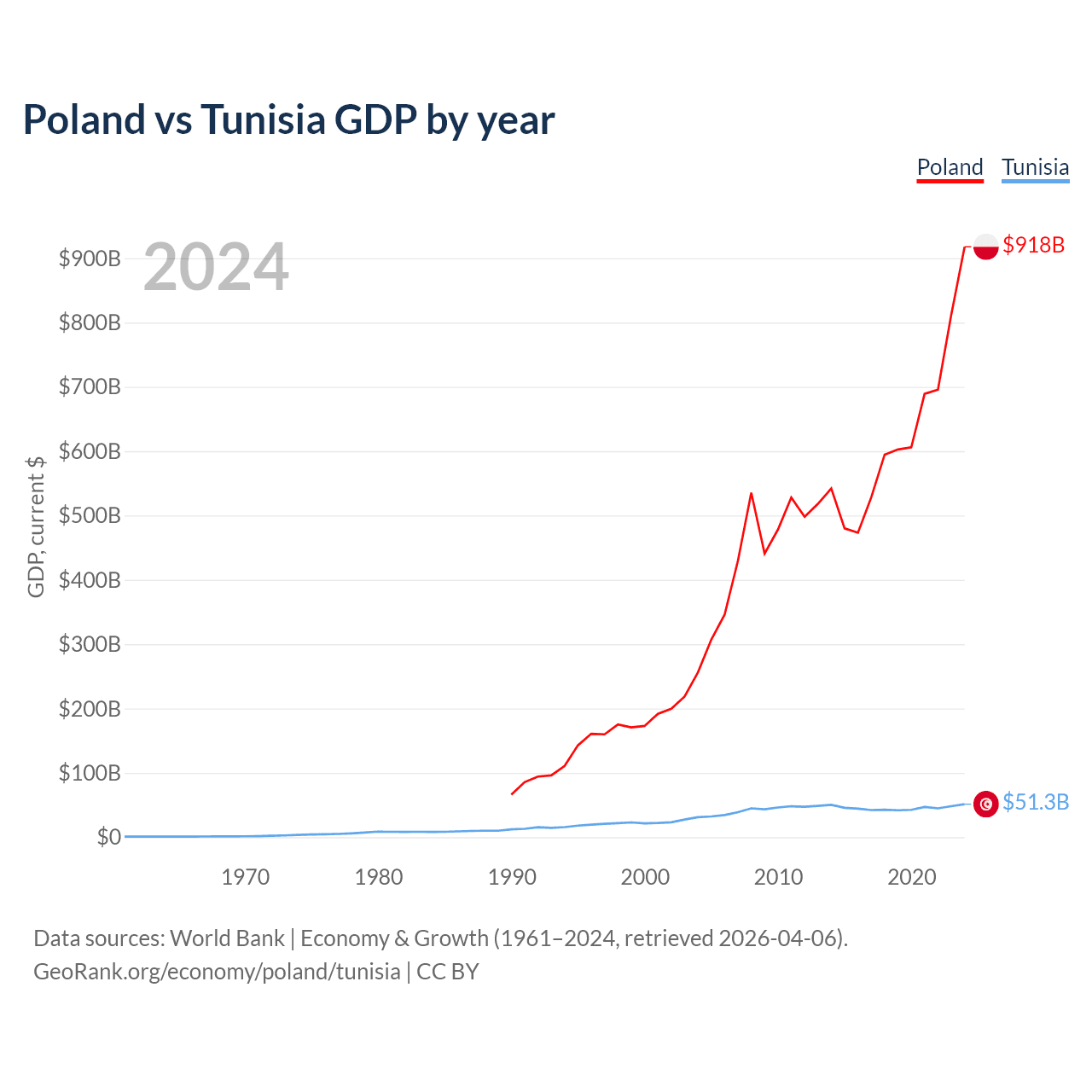 Poland has a GDP of $918B compared to $51.3B for Tunisia, ranking 21/197 and 93/197 by economy size, respectively.