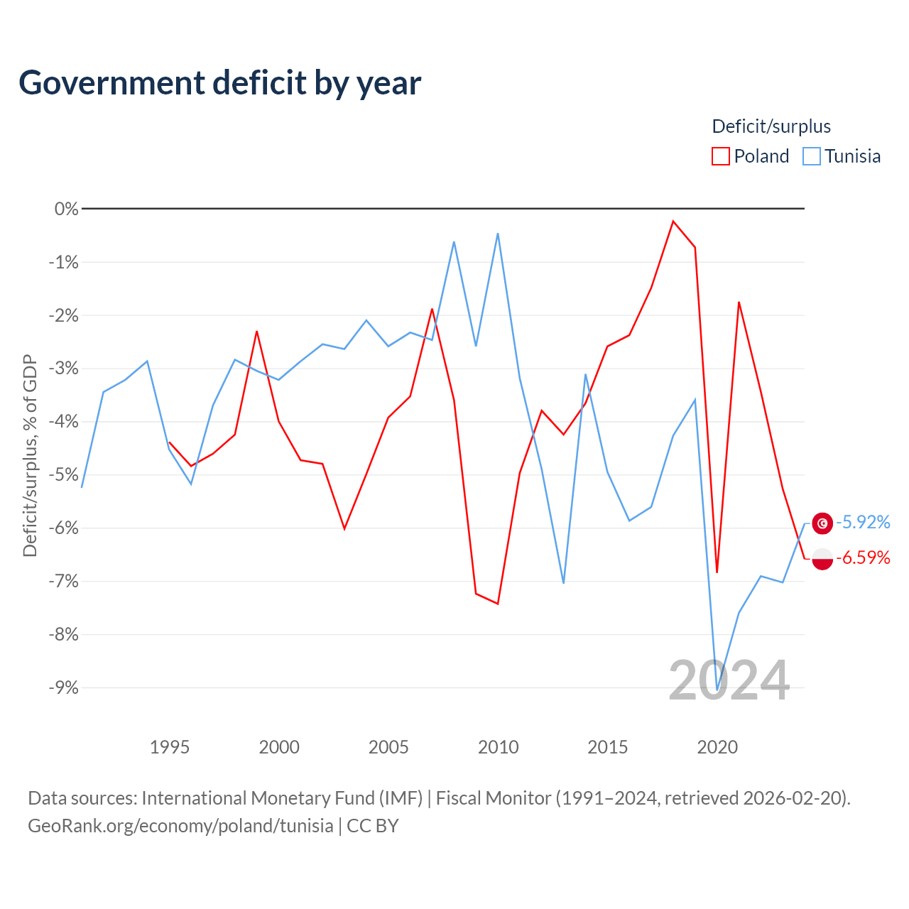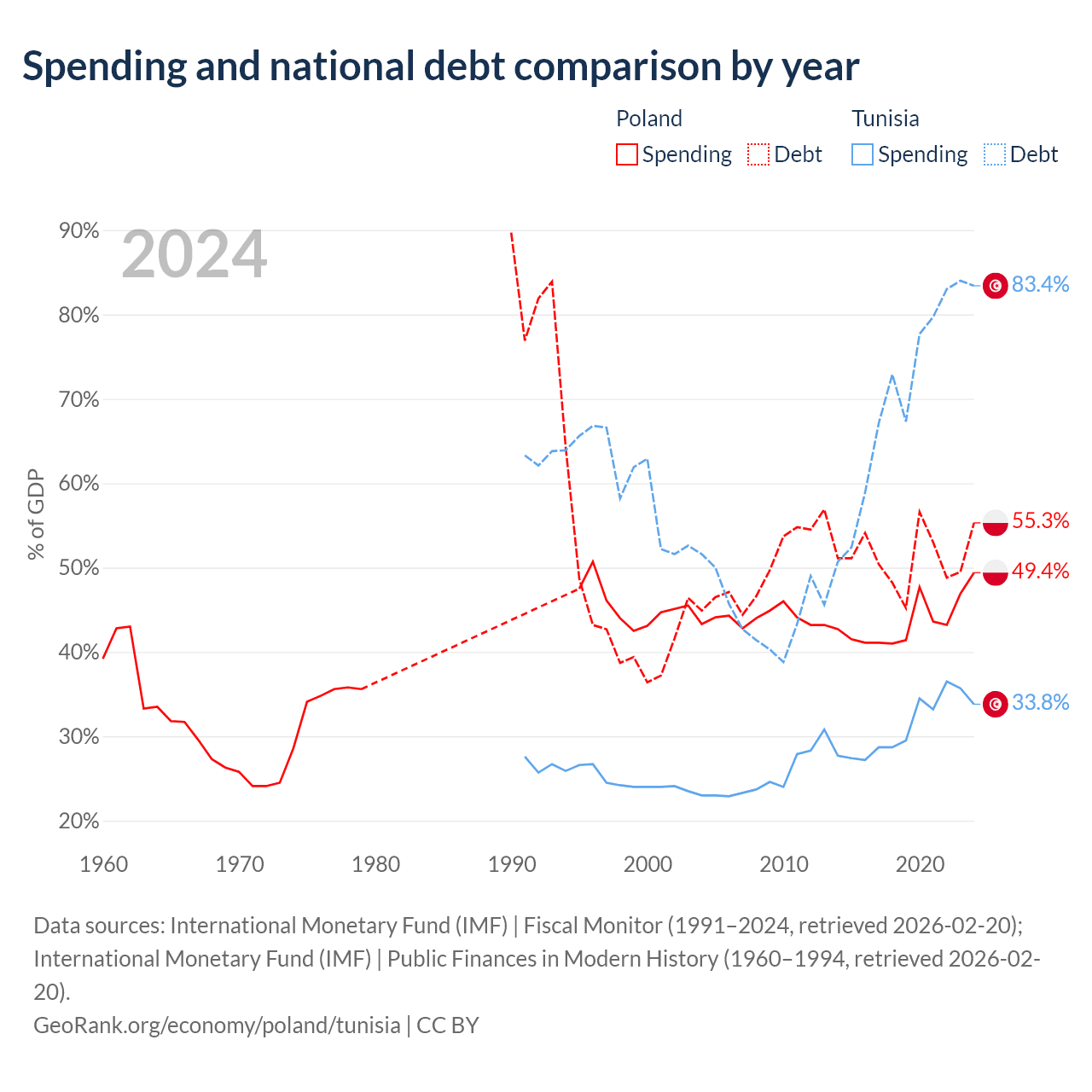Poland has $507B in government debt (55.3% of GDP), compared to $42.8B (83.4% of GDP) in Tunisia.
