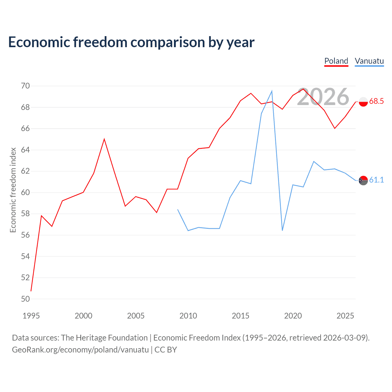The Economic Freedom Index for Poland is 68.5, ranking 46/197, compared to 61.1 for Vanuatu, ranking 92/197. The chart above displays a comparison of annual changes in economic freedom indexes.