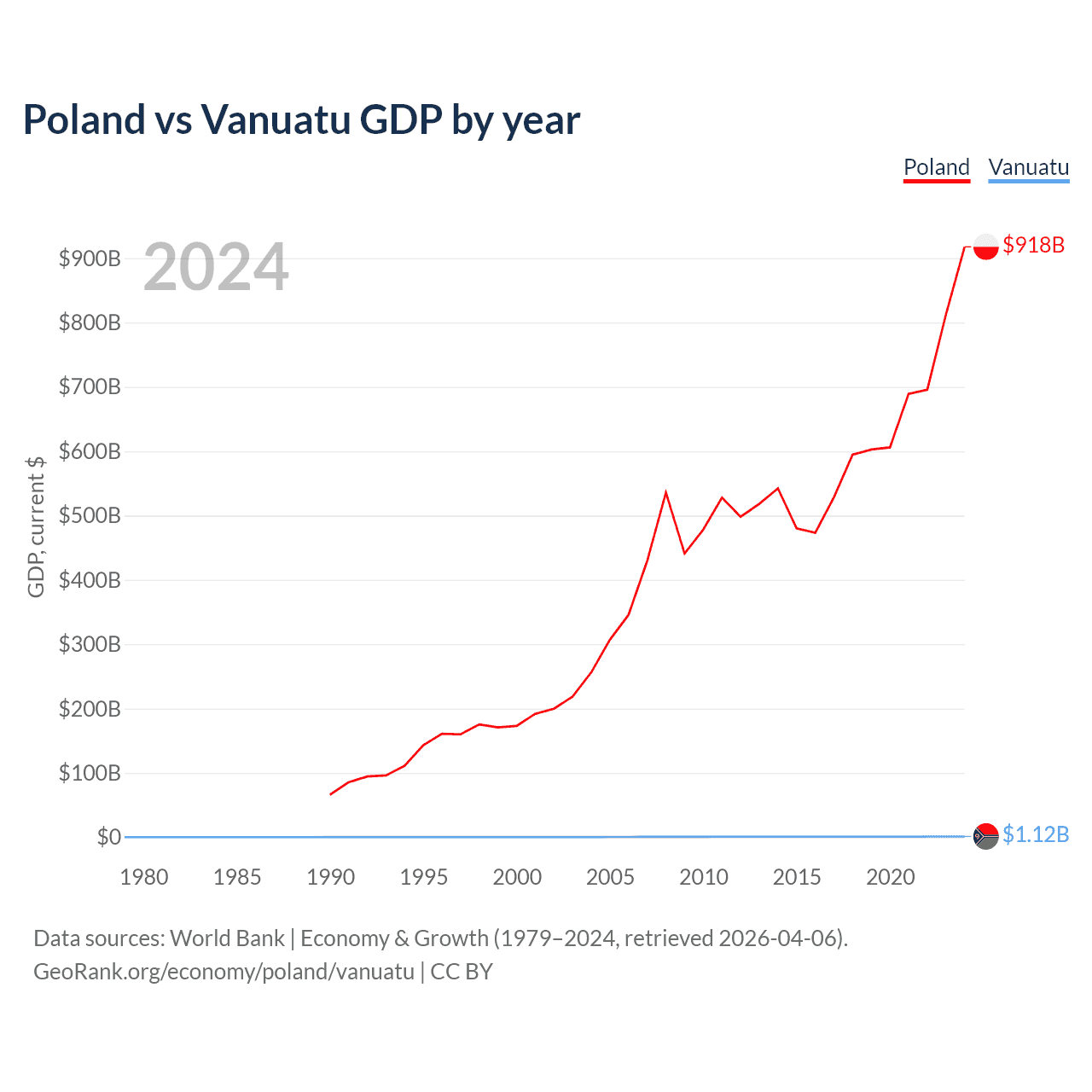 Poland has a GDP of $918B compared to $1.12B for Vanuatu, ranking 21/197 and 188/197 by economy size, respectively.