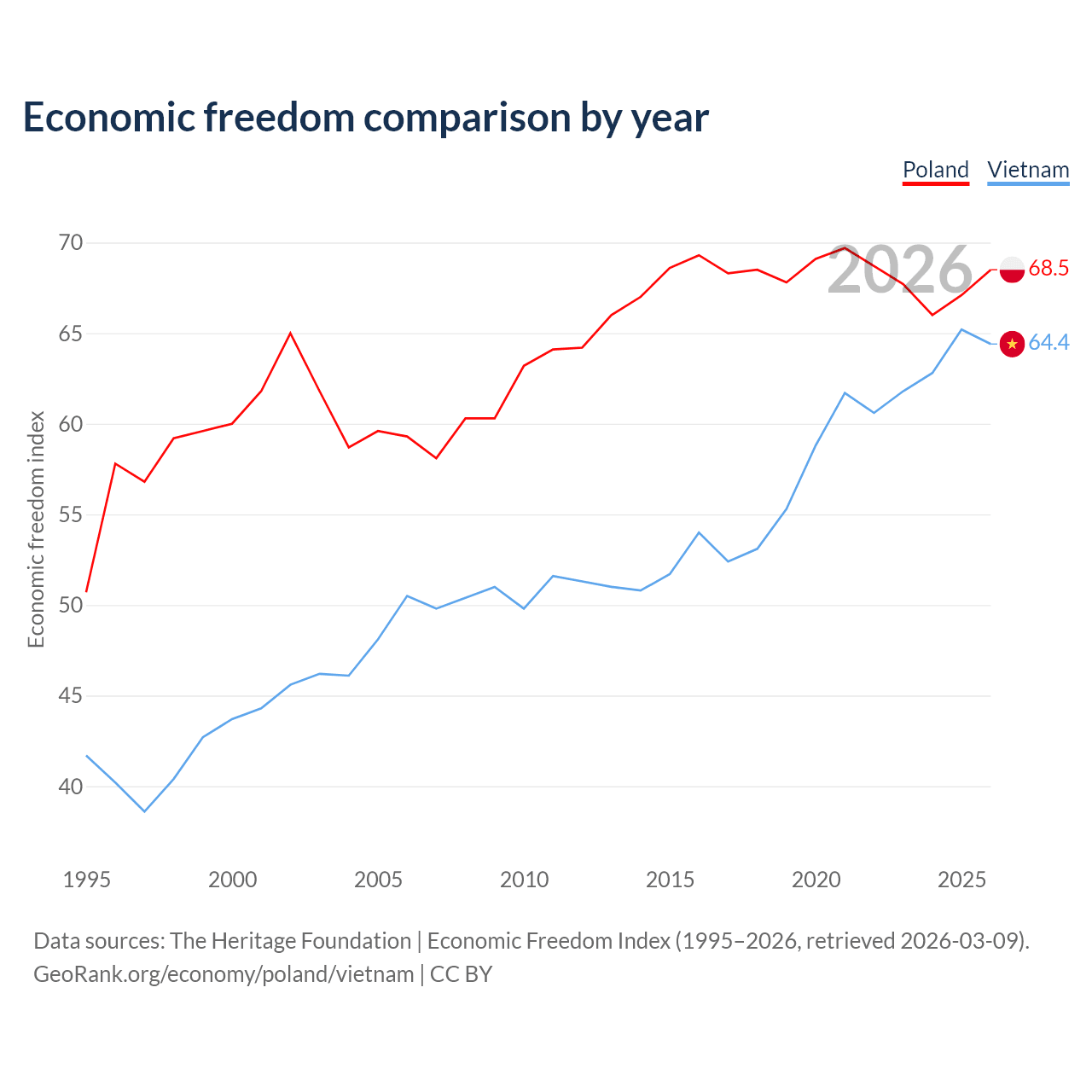 The Economic Freedom Index for Poland is 68.5, ranking 46/197, compared to 64.4 for Vietnam, ranking 73/197. The chart above displays a comparison of annual changes in economic freedom indexes.