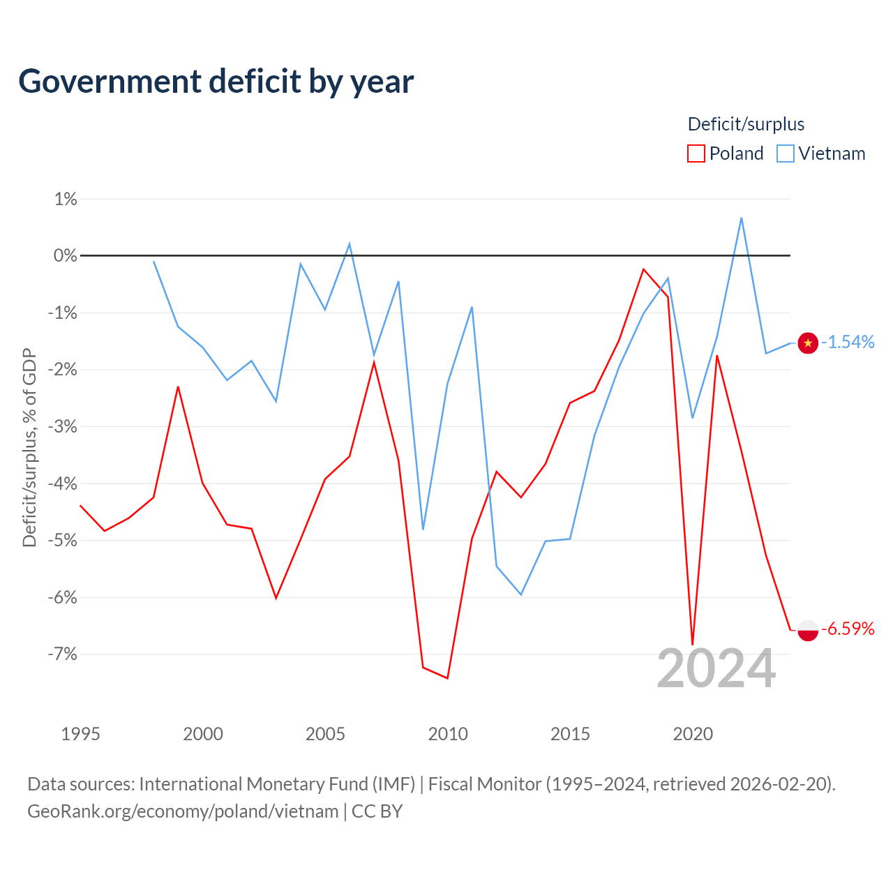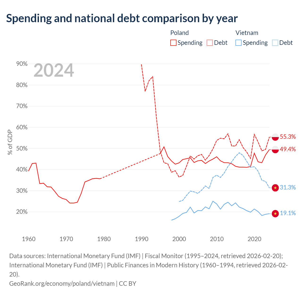 Poland has $507B in government debt (55.3% of GDP), compared to $149B (31.3% of GDP) in Vietnam.