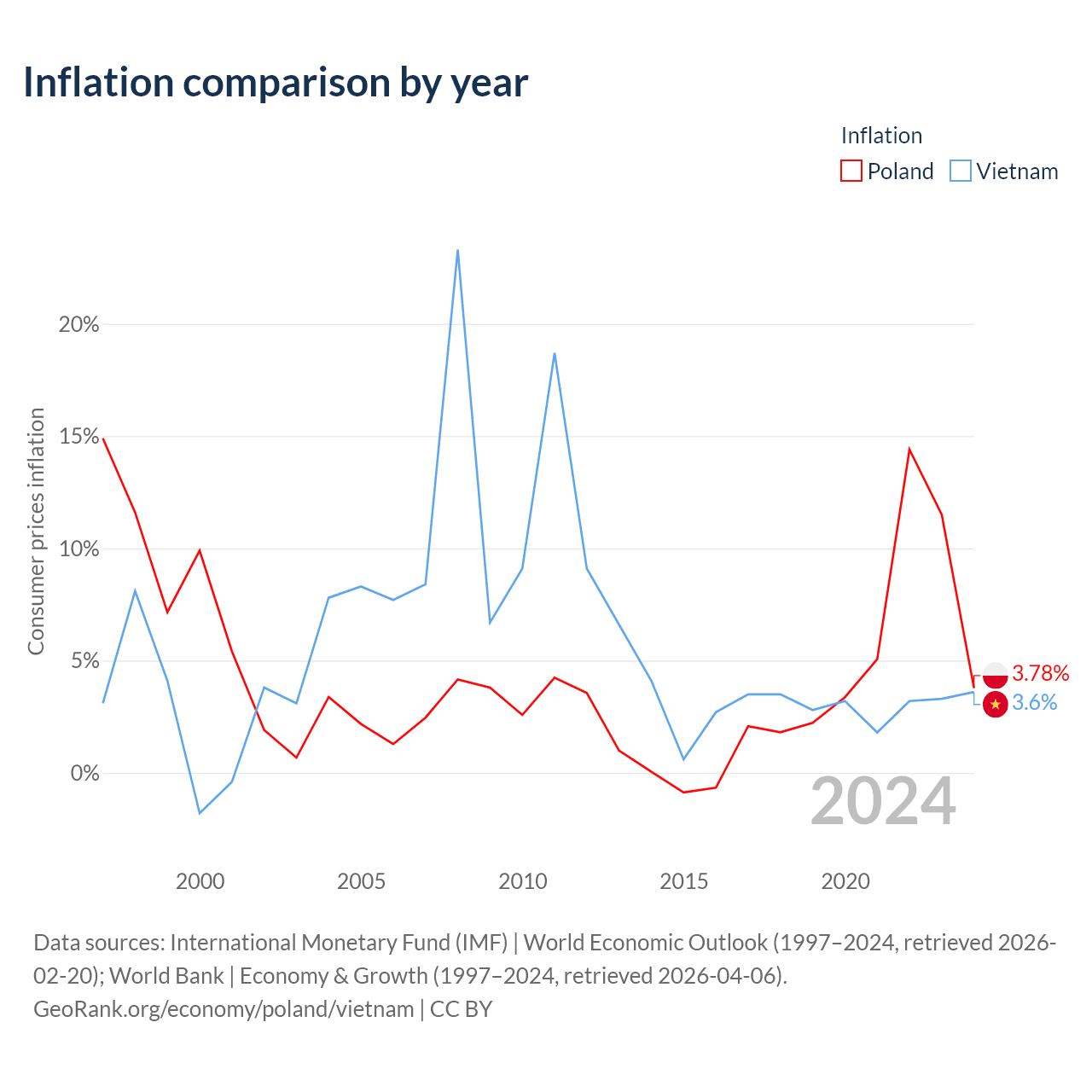 Poland has a GDP of $918B compared to $476B for Vietnam, ranking 21/197 and 33/197 by economy size, respectively.