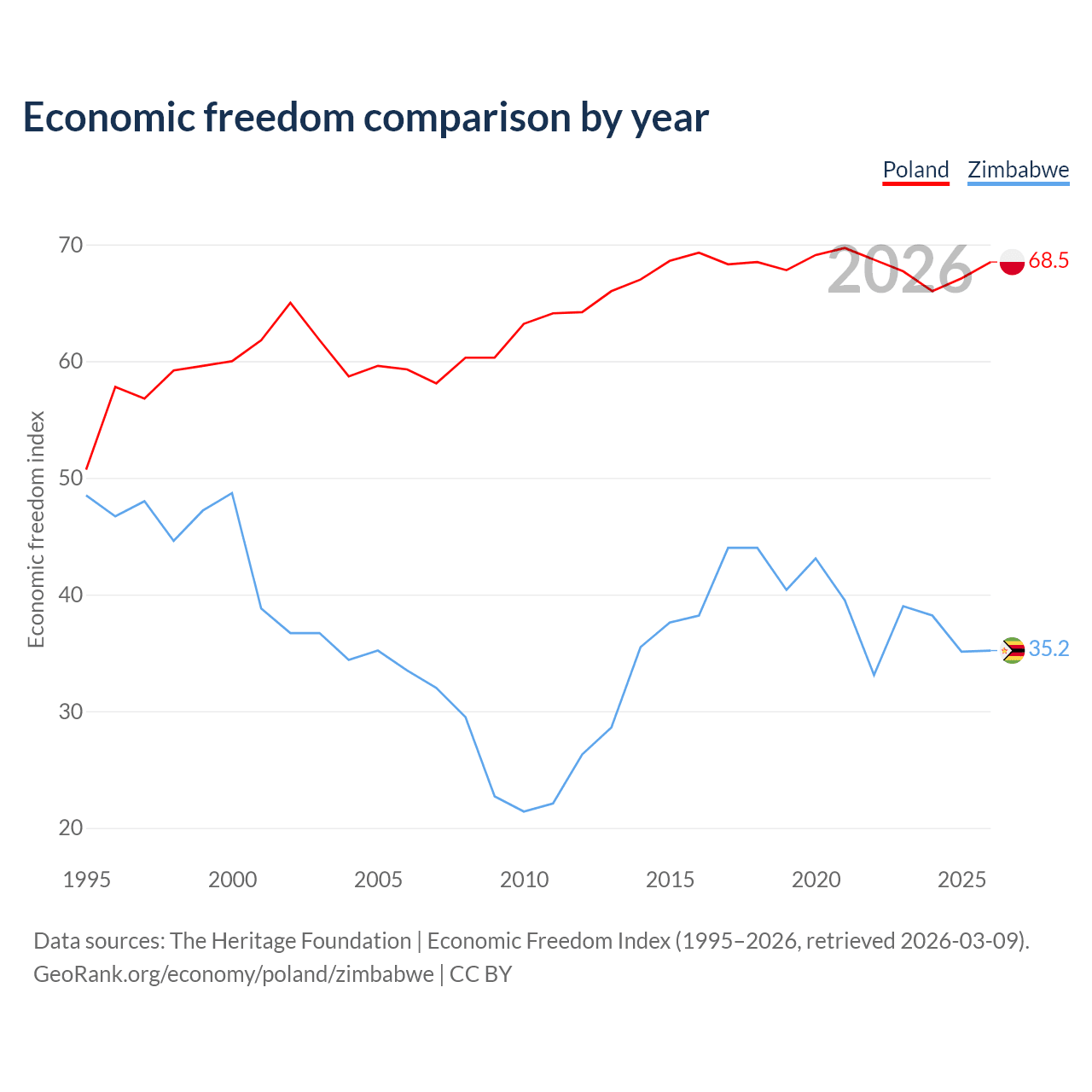 The Economic Freedom Index for Poland is 68.5, ranking 46/197, compared to 35.2 for Zimbabwe, ranking 190/197. The chart above displays a comparison of annual changes in economic freedom indexes.