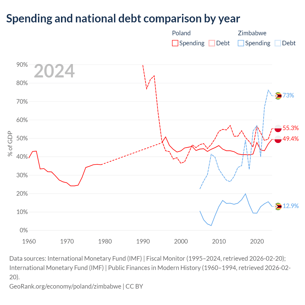 Poland has $507B in government debt (55.3% of GDP), compared to $30.3B (73% of GDP) in Zimbabwe.