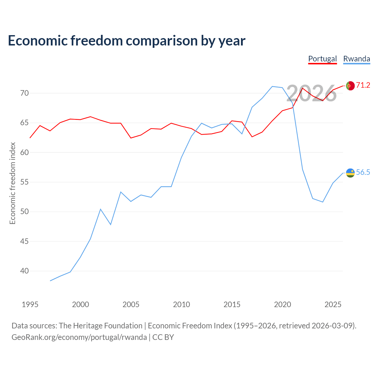 The Economic Freedom Index for Portugal is 71.2, ranking 33/197, compared to 56.5 for Rwanda, ranking 121/197. The chart above displays a comparison of annual changes in economic freedom indexes.