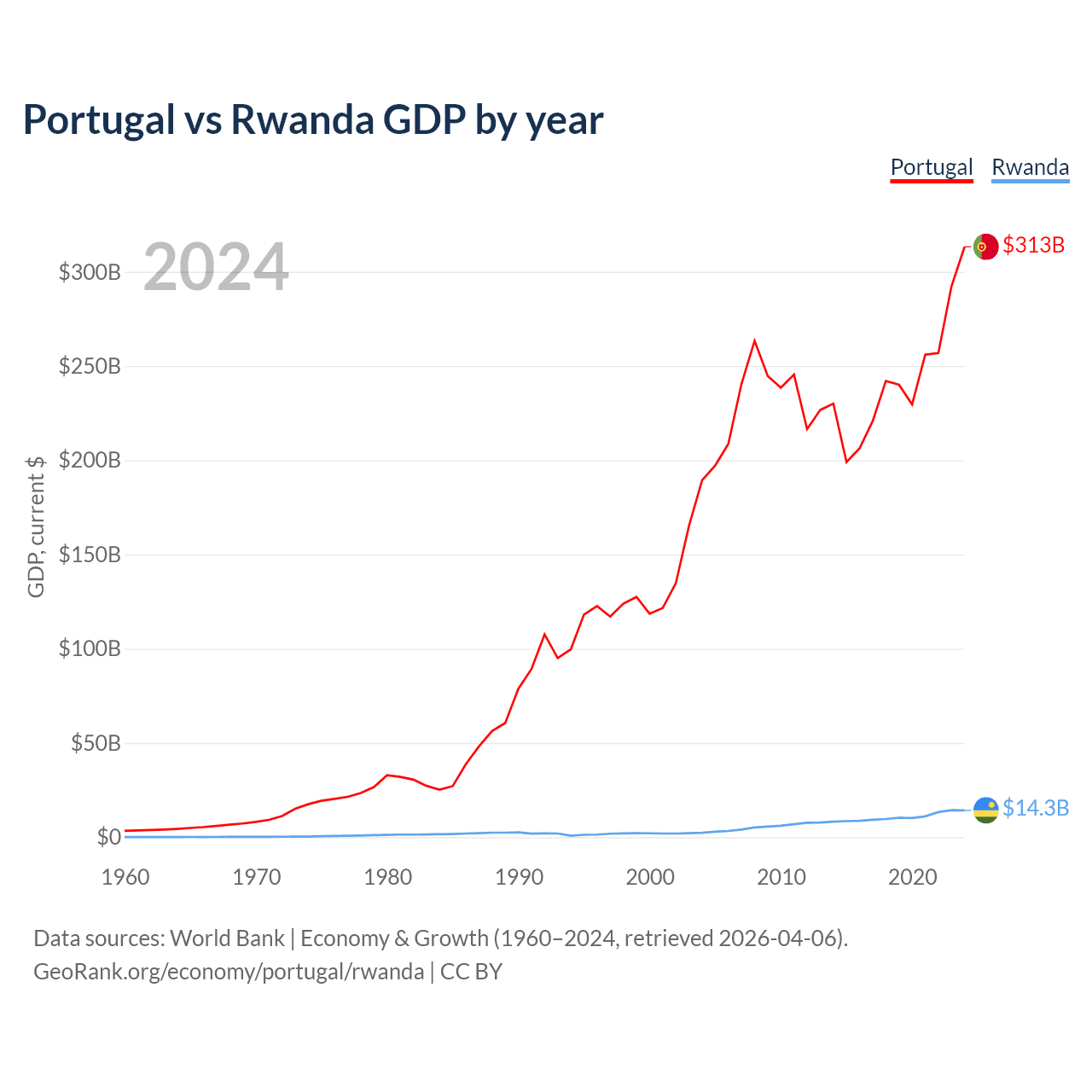 Portugal has a GDP of $313B compared to $14.3B for Rwanda, ranking 46/197 and 144/197 by economy size, respectively.