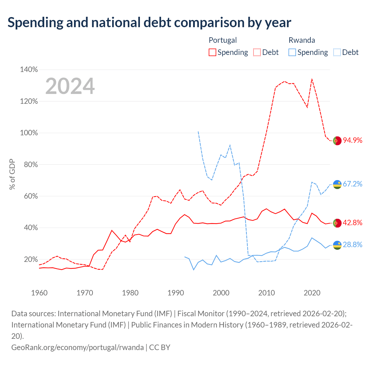Portugal has $297B in government debt (94.9% of GDP), compared to $9.58B (67.2% of GDP) in Rwanda.