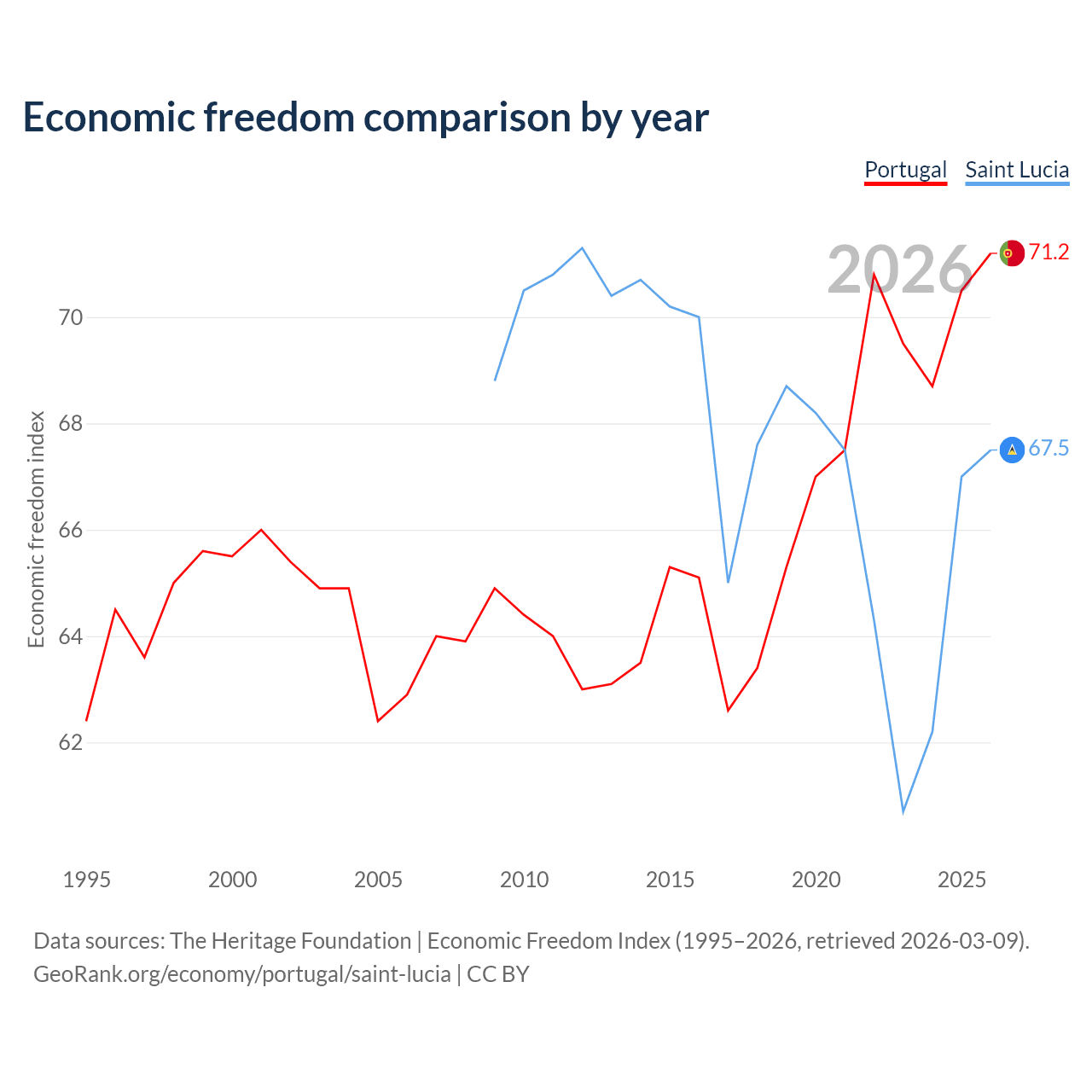 The Economic Freedom Index for Portugal is 71.2, ranking 33/197, compared to 67.5 for Saint Lucia, ranking 57/197. The chart above displays a comparison of annual changes in economic freedom indexes.