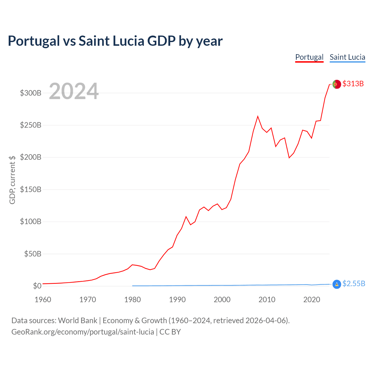 Portugal has a GDP of $313B compared to $2.55B for Saint Lucia, ranking 46/197 and 173/197 by economy size, respectively.