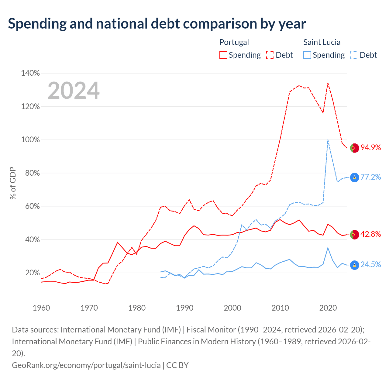 Portugal has $297B in government debt (94.9% of GDP), compared to $1.97B (77.2% of GDP) in Saint Lucia.