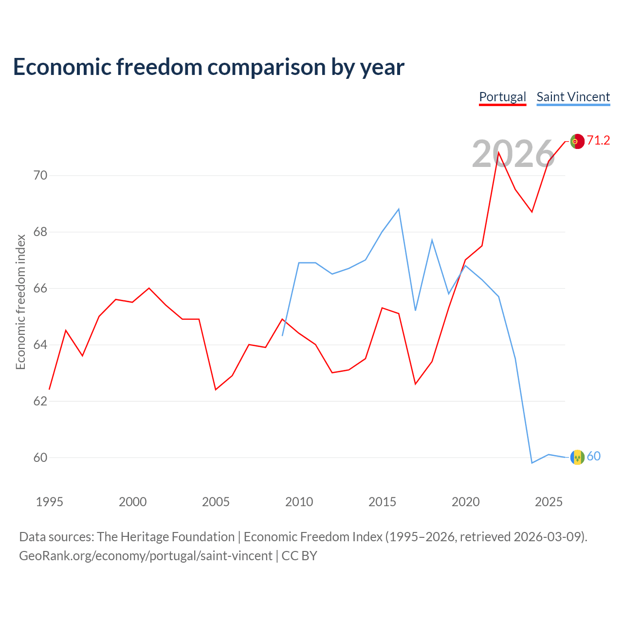 The Economic Freedom Index for Portugal is 71.2, ranking 33/197, compared to 60 for Saint Vincent, ranking 98/197. The chart above displays a comparison of annual changes in economic freedom indexes.