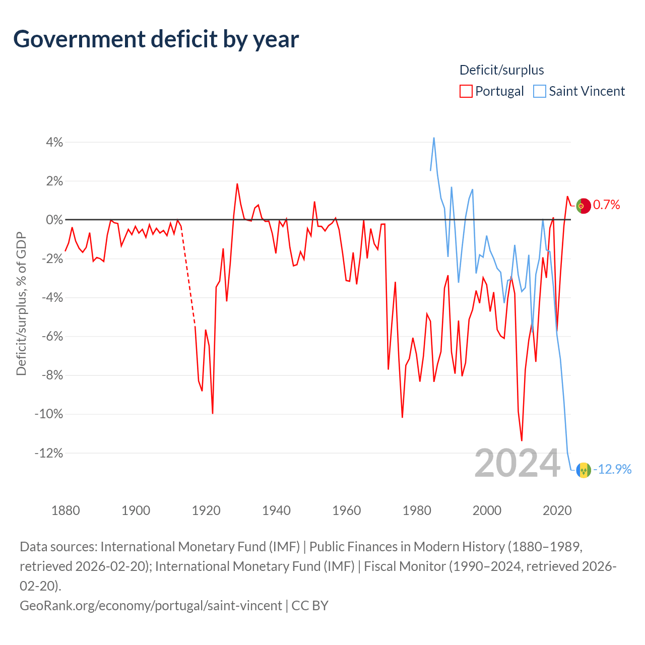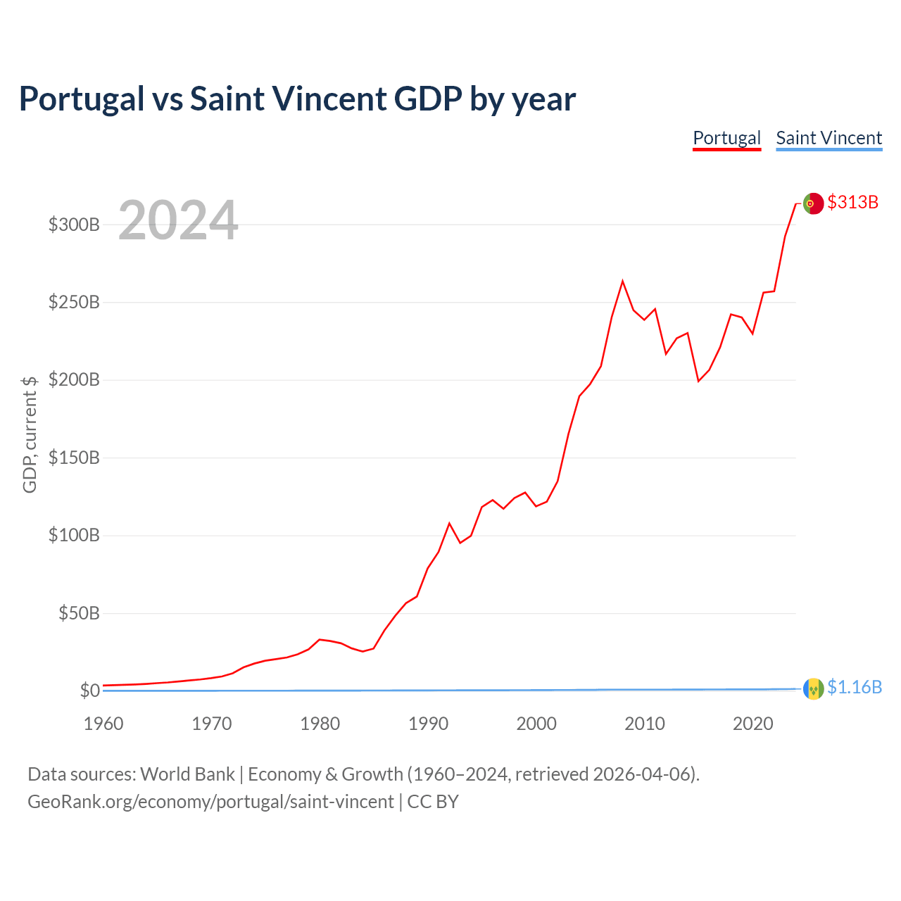 Portugal has a GDP of $313B compared to $1.16B for Saint Vincent, ranking 46/197 and 186/197 by economy size, respectively.