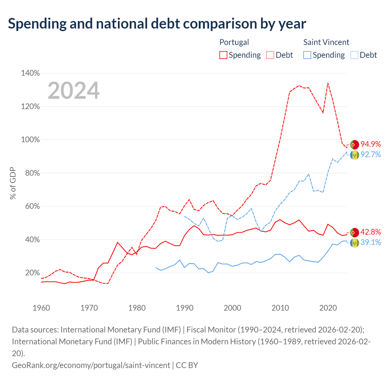 Portugal has $297B in government debt (94.9% of GDP), compared to $1.07B (92.7% of GDP) in Saint Vincent.