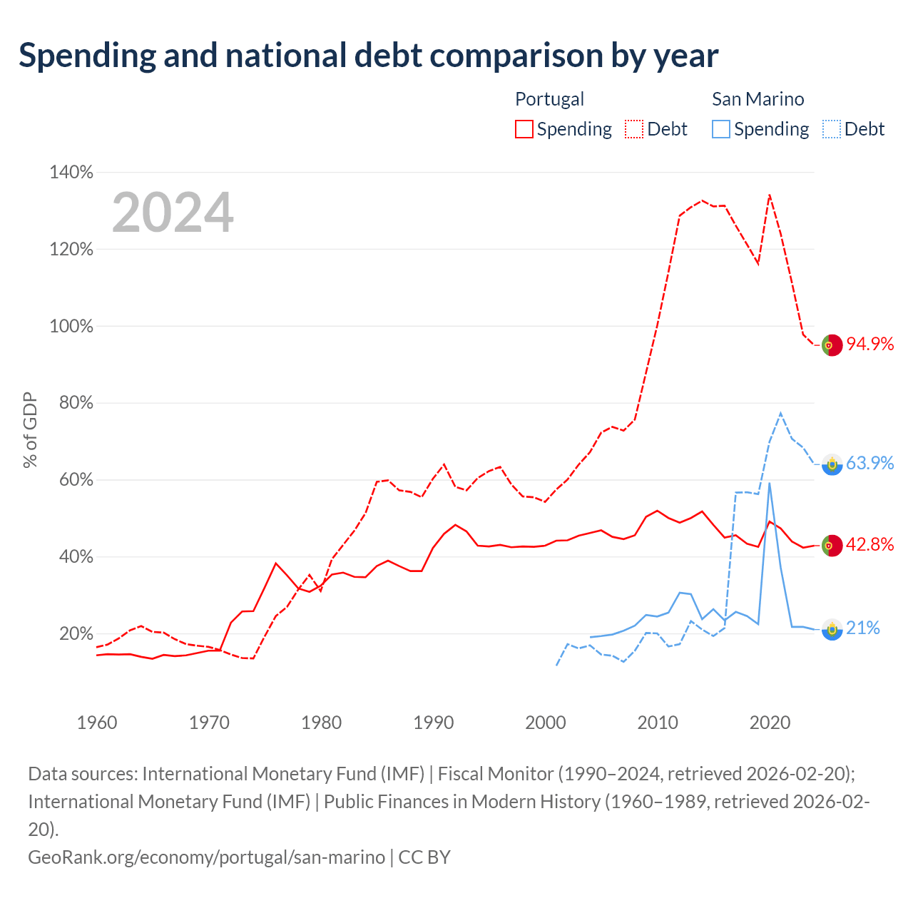 Portugal has $297B in government debt (94.9% of GDP), compared to $1.39B (63.9% of GDP) in San Marino.