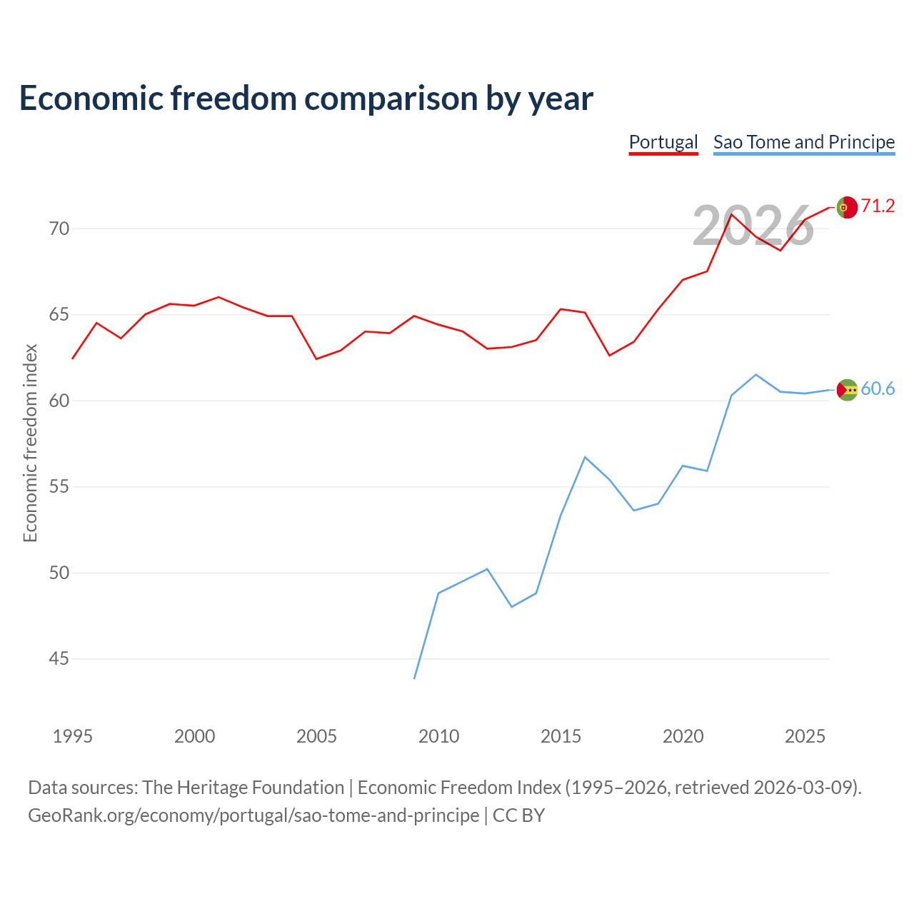The Economic Freedom Index for Portugal is 71.2, ranking 33/197, compared to 60.6 for Sao Tome and Principe, ranking 93/197. The chart above displays a comparison of annual changes in economic freedom indexes.