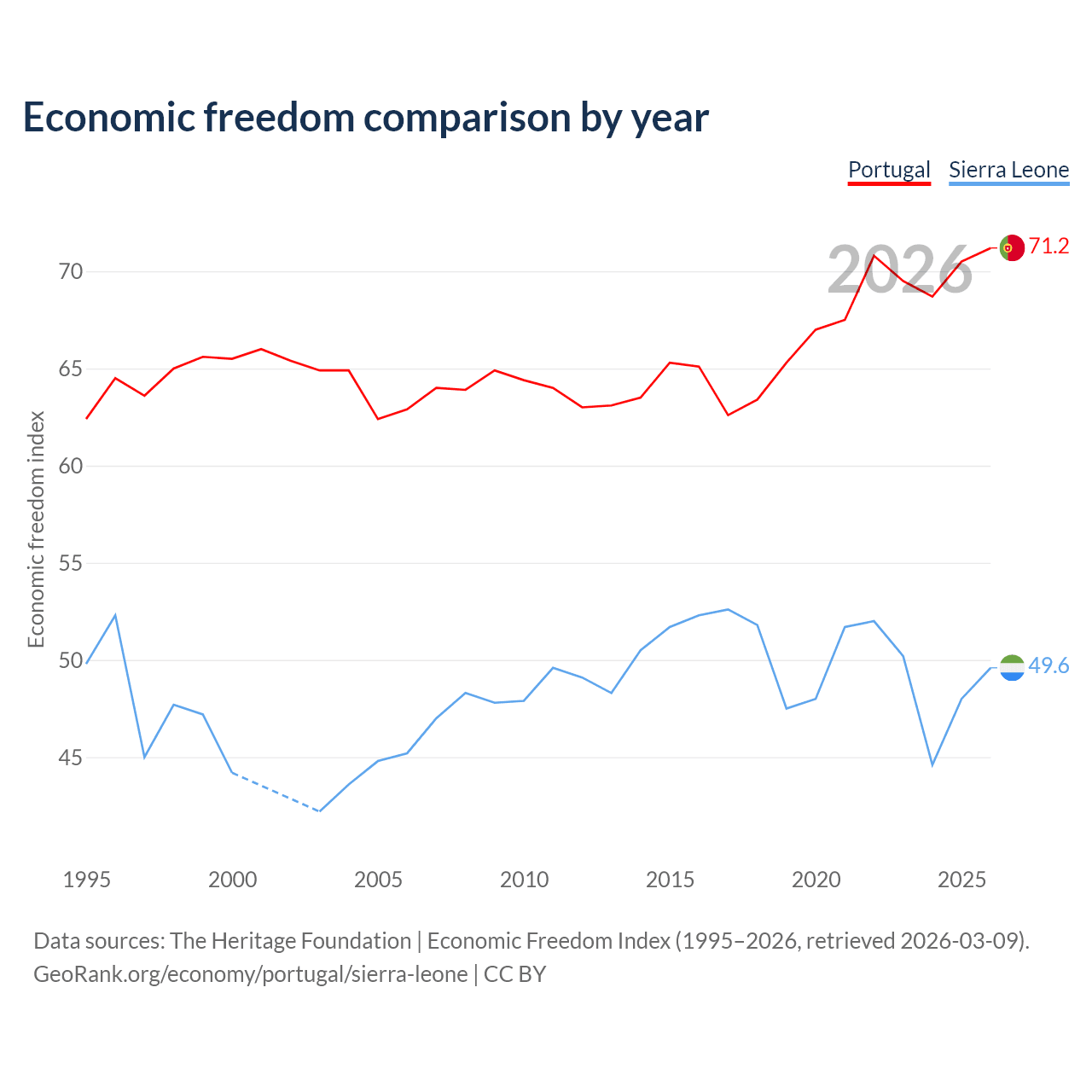 The Economic Freedom Index for Portugal is 71.2, ranking 33/197, compared to 49.6 for Sierra Leone, ranking 165/197. The chart above displays a comparison of annual changes in economic freedom indexes.
