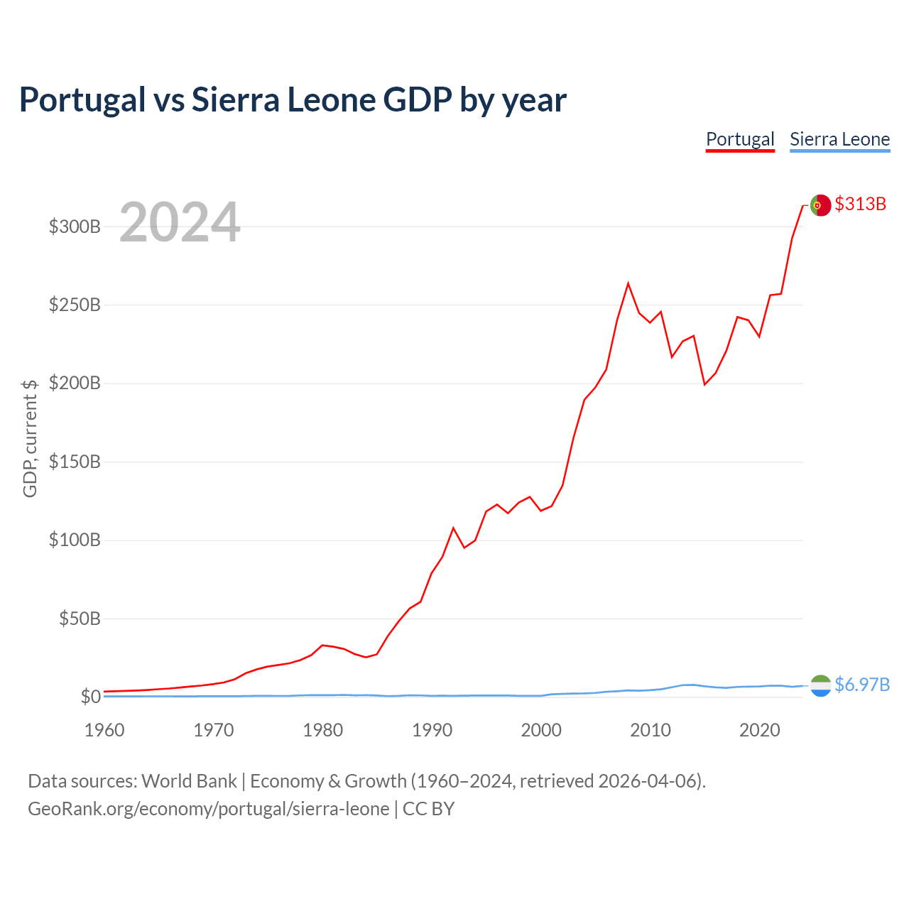 Portugal has a GDP of $313B compared to $6.97B for Sierra Leone, ranking 46/197 and 160/197 by economy size, respectively.