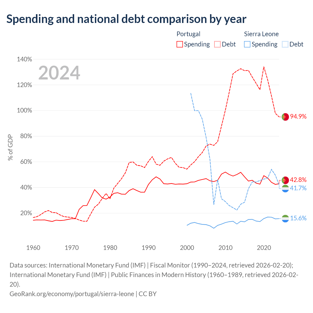 Portugal has $297B in government debt (94.9% of GDP), compared to $2.91B (41.7% of GDP) in Sierra Leone.