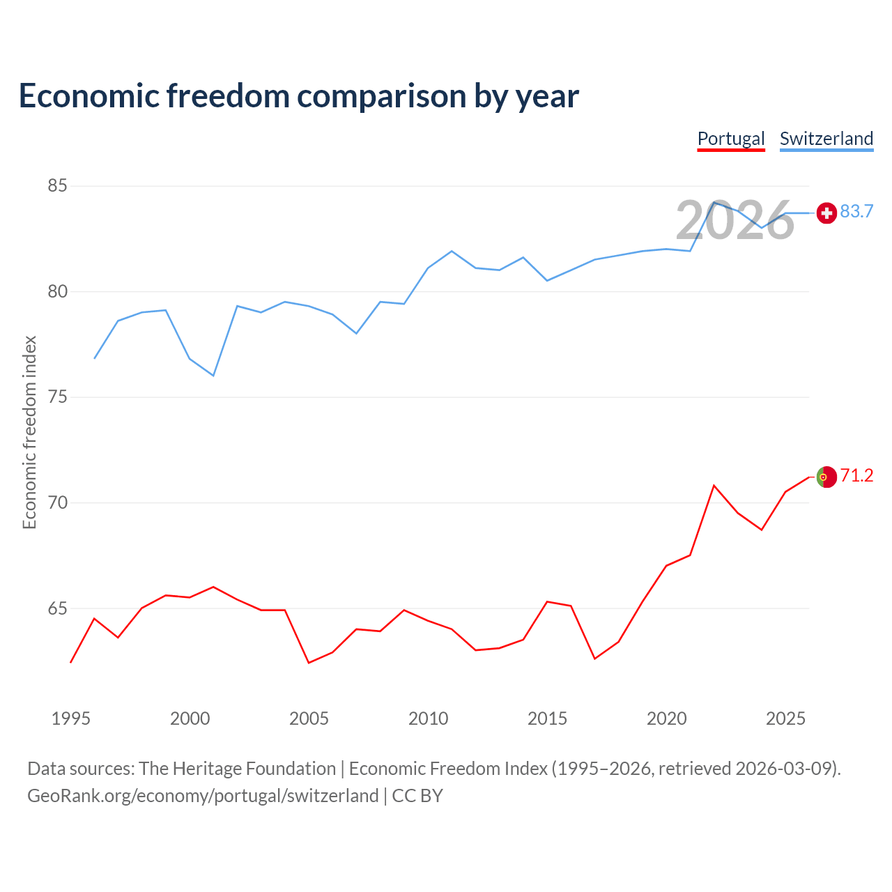 The Economic Freedom Index for Portugal is 71.2, ranking 33/197, compared to 83.7 for Switzerland, ranking 2/197. The chart above displays a comparison of annual changes in economic freedom indexes.
