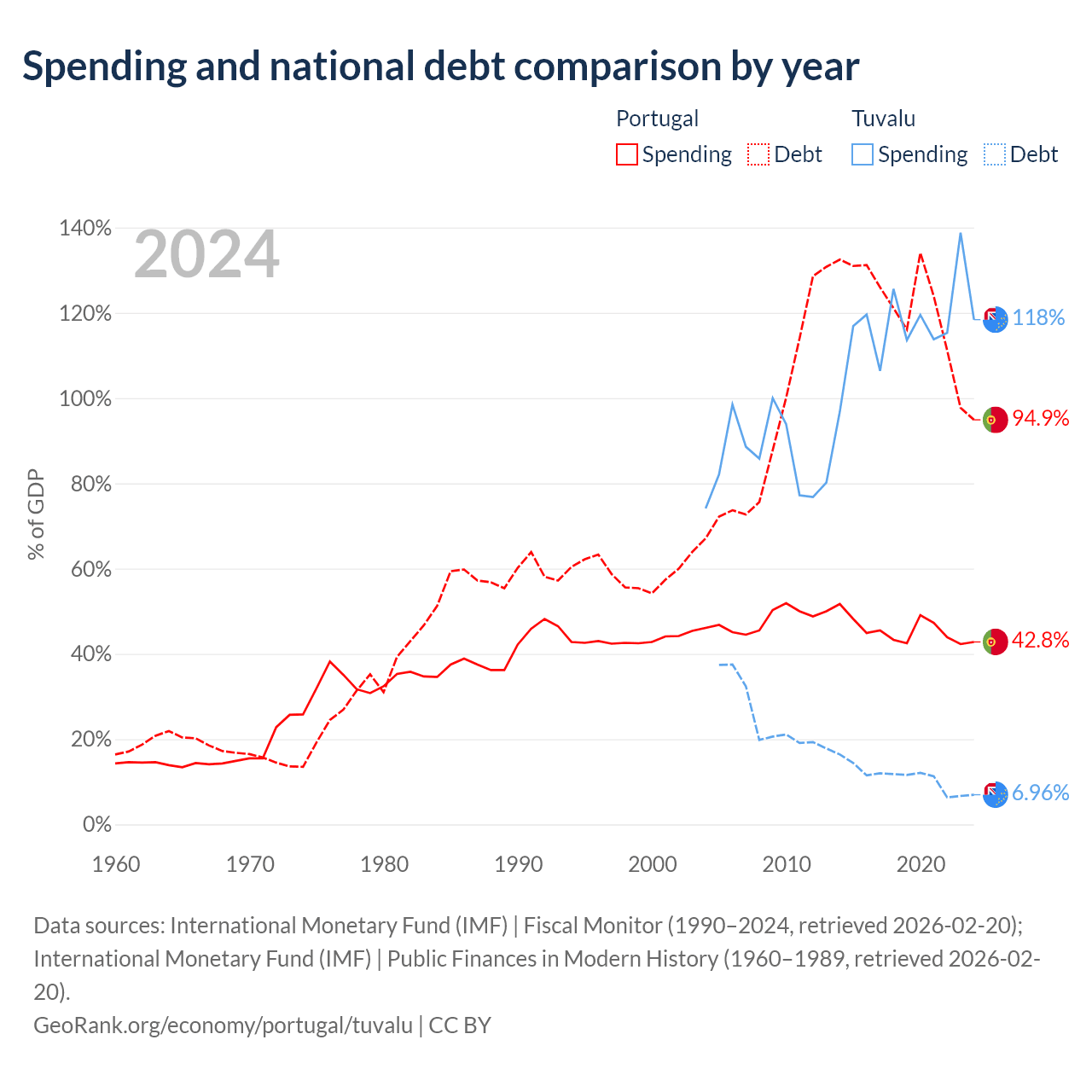 Portugal has $297B in government debt (94.9% of GDP), compared to $4.15M (6.96% of GDP) in Tuvalu.