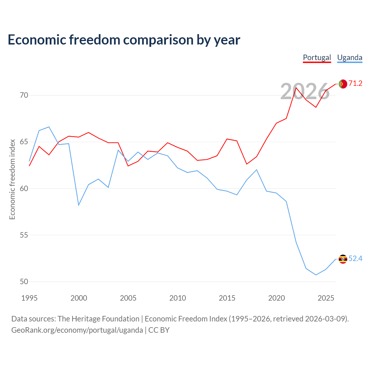 The Economic Freedom Index for Portugal is 71.2, ranking 33/197, compared to 52.4 for Uganda, ranking 149/197. The chart above displays a comparison of annual changes in economic freedom indexes.