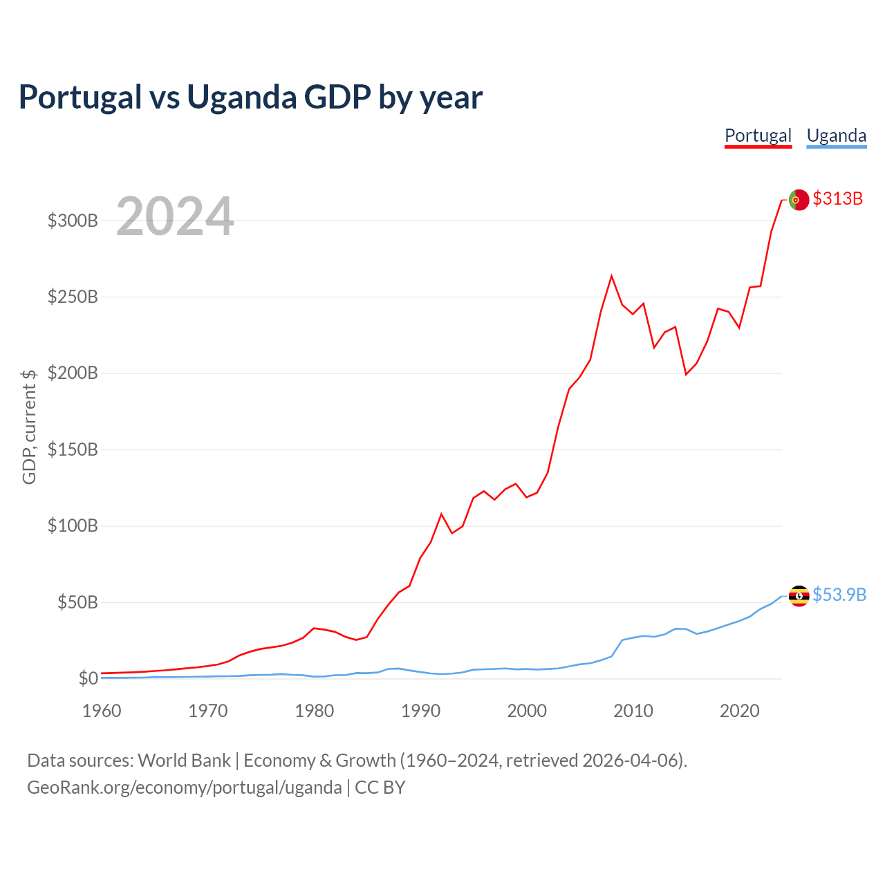 Portugal has a GDP of $313B compared to $53.9B for Uganda, ranking 46/197 and 89/197 by economy size, respectively.