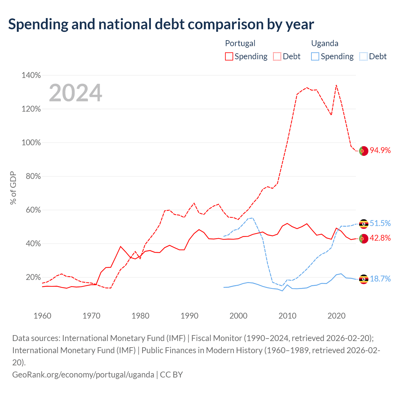 Portugal has $297B in government debt (94.9% of GDP), compared to $27.8B (51.5% of GDP) in Uganda.