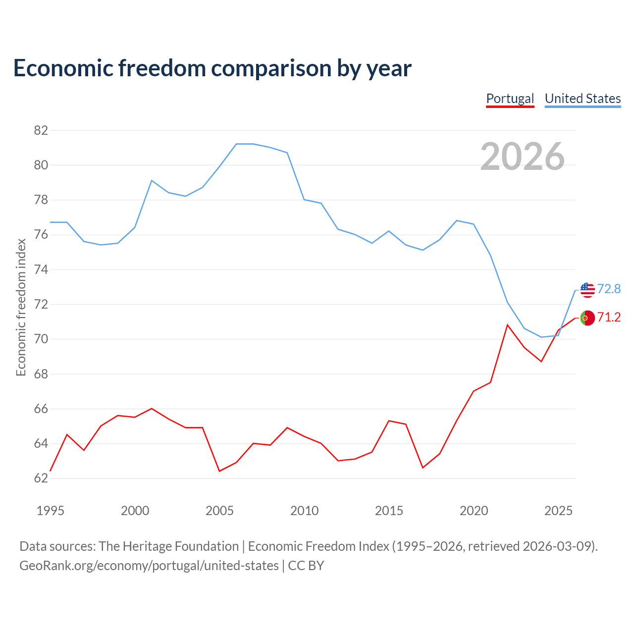 Data sources: The Heritage Foundation | Economic Freedom Index (1995–2026, retrieved 2026-03-09).