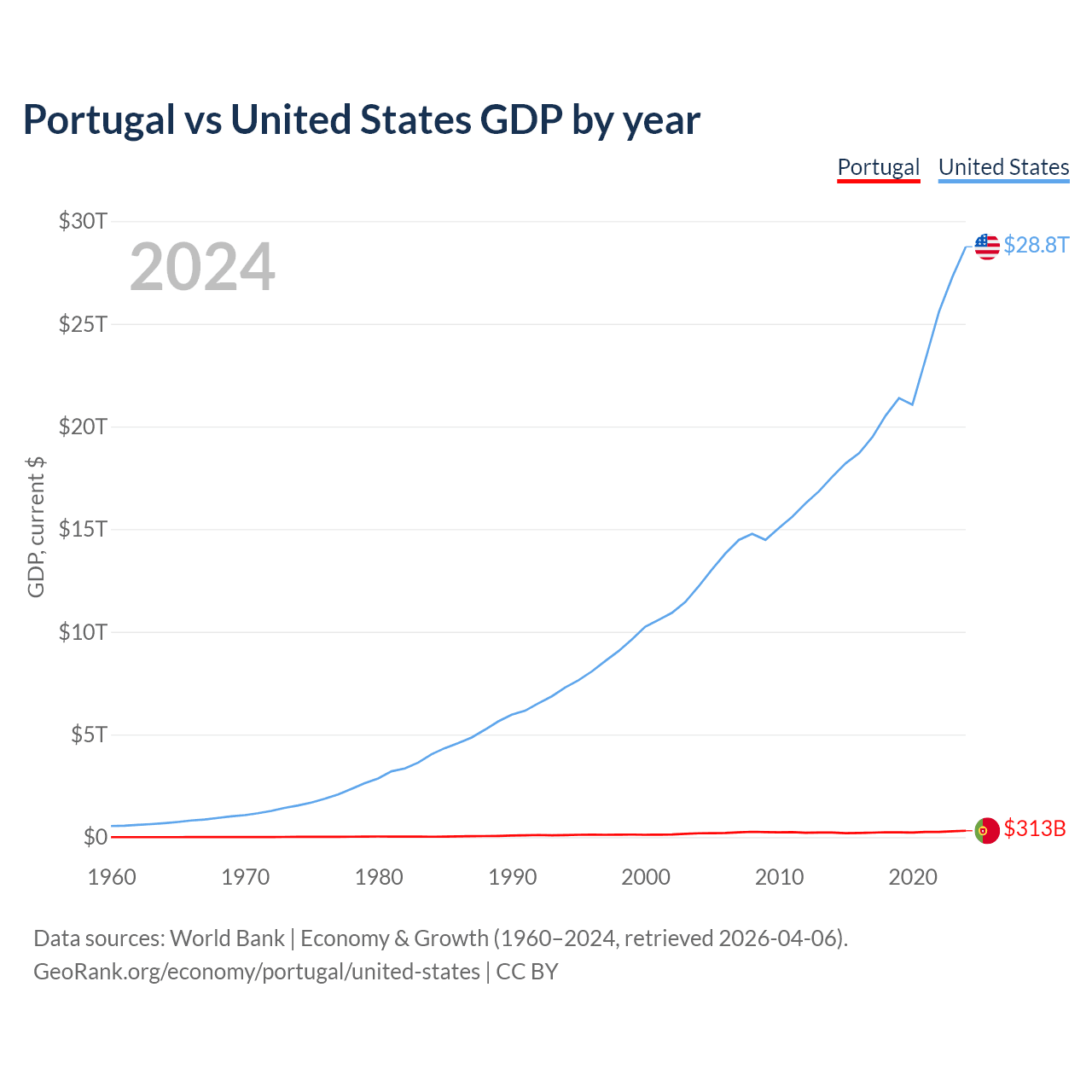 Portugal has a GDP of $313B compared to $28.8T for the United States, ranking 46/197 and 1/197 by economy size, respectively.